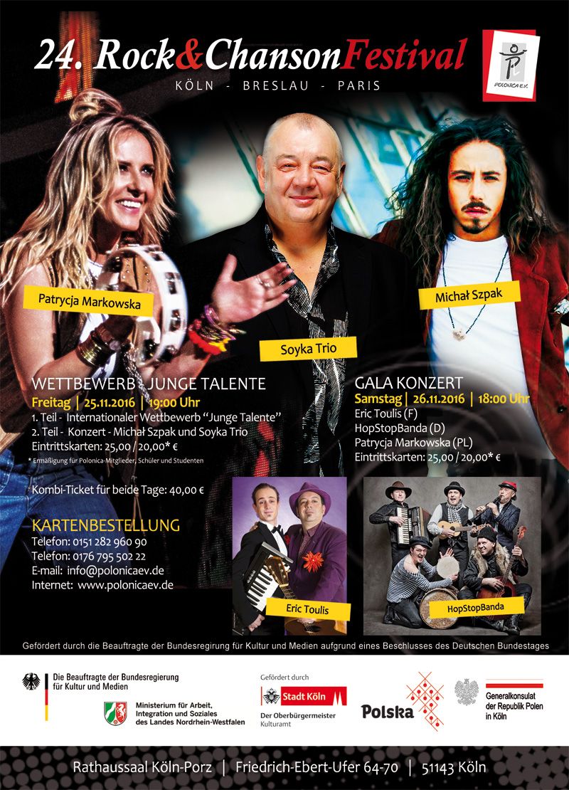 Bereits zum 24. Mal lud die deutsch-polnische Kulturgesellschaft „Polonica“ e.V. zum zweitägigen Rock&Chanson Festival in den Rathaussaal in Köln-Porz. Auf der Bühne standen traditionell junge Talente und etablierte Musiker aus Deutschland, Polen und Frankreich zusammen.