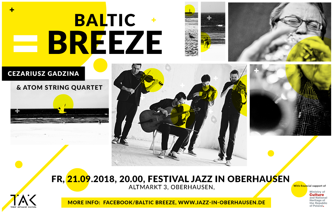 Baltic Breeze steht für eine integrierte Jazzkonzertreihe in den baltischen Ländern, die zweifelsohne eine besondere Gelegenheit für Jazzkenner ist. Eine originelle Instrumentalbesetzung, die Homogenität der sechzehn Saiten des Quartetts sowie das einzigartige Timbre des Saxofonisten Cezariusz Gadzina geben dem Konzert eine außergewöhnliche Note. Dank der gelungenen Dramaturgie sowie bezaubernder Klanglandschaften begibt sich der Zuhörer auf eine unvergessliche Reise, die ihn bis zur letzten Minute des Konzerts in ihren Bann zieht. Die Interpreten schaffen einen neuen musikalische Raum, in dem der von der Folkloremusik inspirierte Jazz sich auf neue phänomenale Weise enthüllt. Pikant wird die Musik durch eine gewisse Experimentierfreude. Ihre gemeinsame Platte „The Fifth Element”, veröffentlicht durch TAK Records, www.takrecords.eu, wurde im holländischen Jazzmagazin JAZZISM als Album des Jahres 2016 bezeichnet.