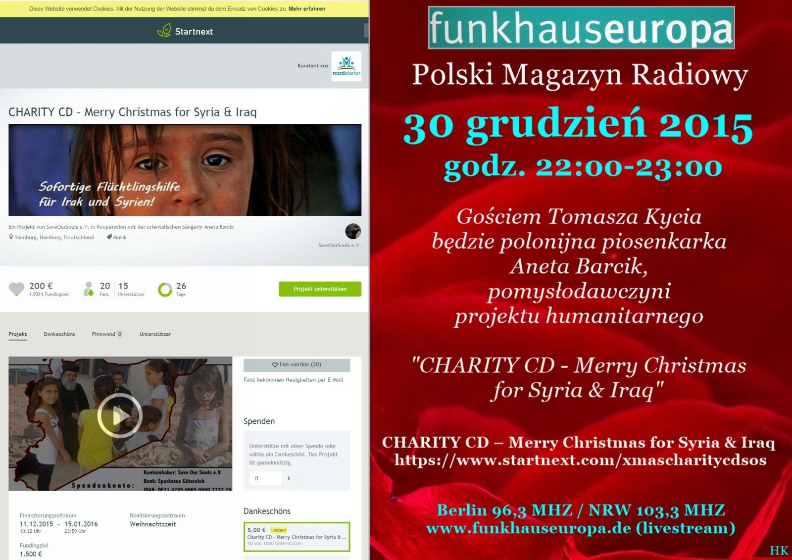 - Wie funktioniert das Crowd Funding? Auf diesem Portal hier könnt Ihr die „CHARITY CD – Merry Christmas for Syria & Iraq“ vorbestellen. Ihr bezahlt einfach 5 € (+ Versand) mit Kreditkarte oder Paypal. Eingezogen wird der Betrag erst NACH erolgreicher Beendigung der Projektsumme.