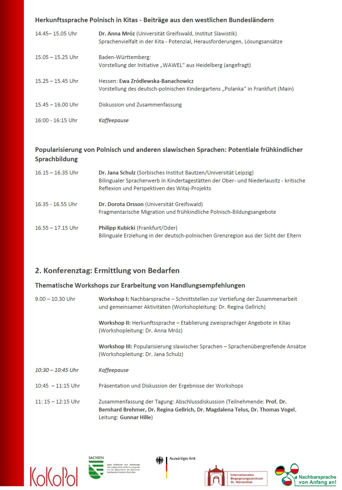 Sehr geehrte Damen und Herren, anbei sende ich Ihnen das aktualisierte Programm für die Fachtagung „Frühkindliches Lernen im deutsch-polnischen Verflechtungsraum“, die KoKoPol in Kooperation mit der Sächsischen Landesstelle für nachbarsprachige Bildung (LaNa) vom 07. bis zum 08.10.2021 am Internationalen Begegnungszentrum St. Marienthal organisiert. Vorgestellt und diskutiert werden Modelle und Best-Practice-Beispiele früher nachbarsprachiger Bildung aus Sachsen, Brandenburg und Mecklenburg-Vorpommern ebenso wie Konzepte anderer Bundesländer ohne direkte Grenzlage, jedoch mit großer Anzahl polnischer Herkunftssprachler*innen.