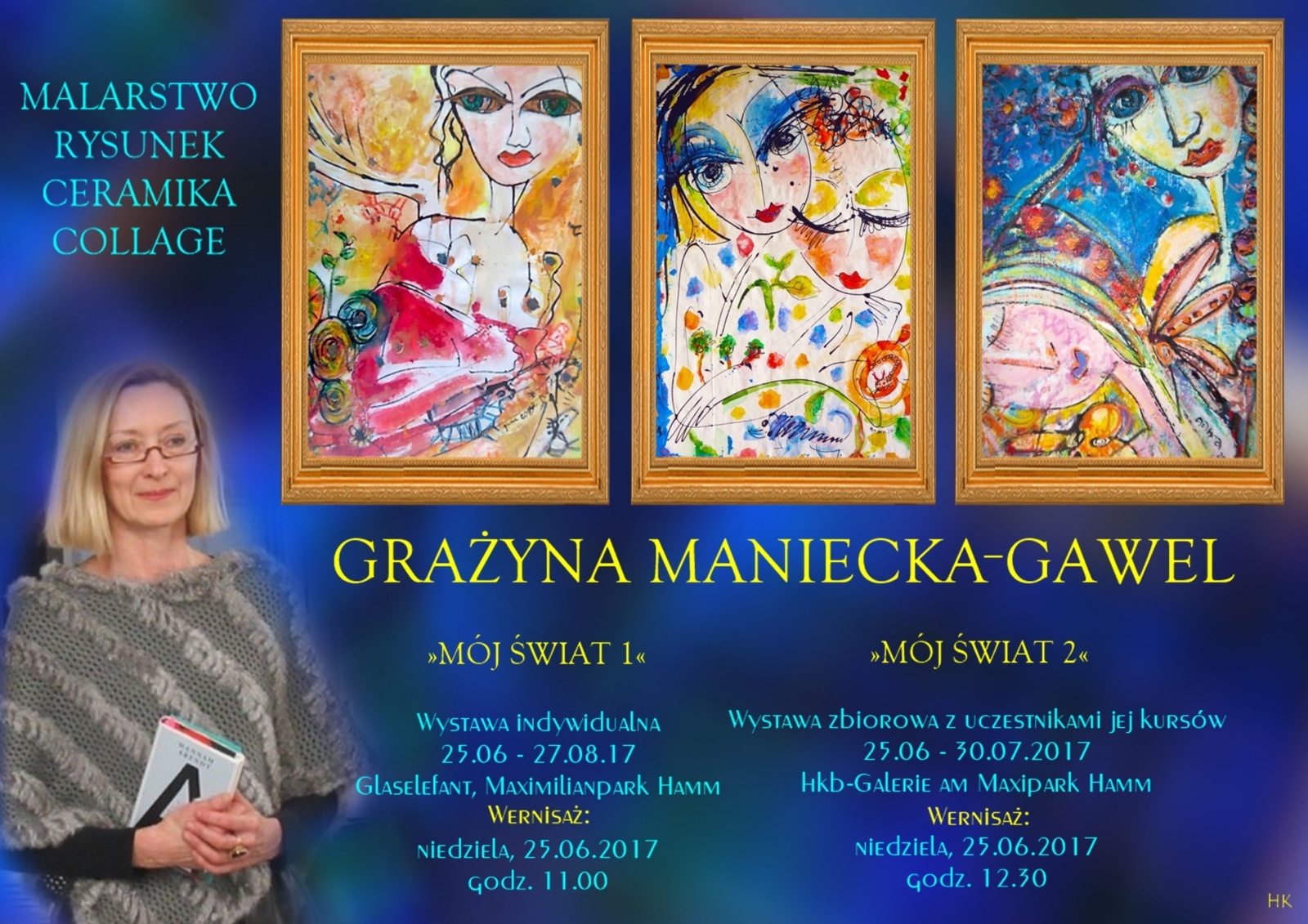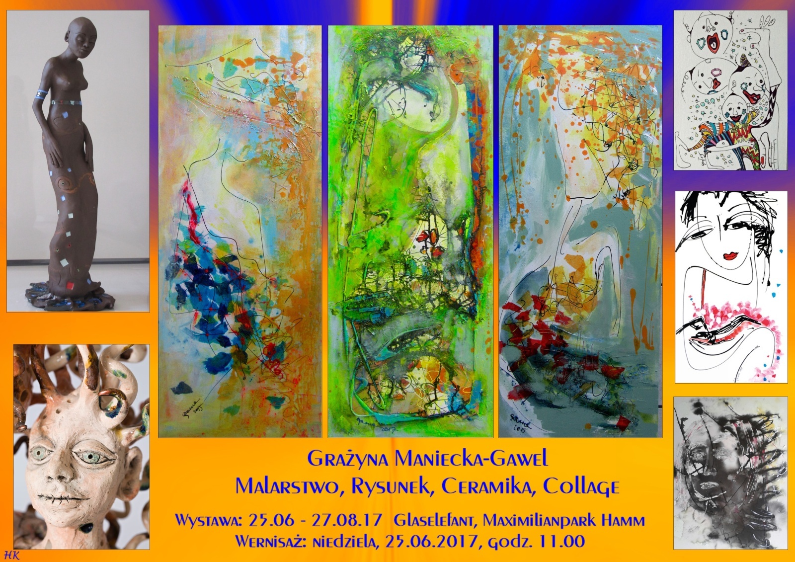 Eröffnung der Einzelausstellung von Grazyna Maniecki-Gawel beginnt 25. Juni 2017 um 11.00 Uhr in einem, sehr symbolischen für die Stadt Hamm Gebäude, im Glaselefanten, im Maximilianpark in Hamm, Alter Grenzweg 2 und wird bis zum 27. August dauern, und die zweite, Gemeinschaftspräsentation am gleichen Tag um 12:30 Uhr in der Hammer Künstlerbund Galerie, ebenso im Maximilianpark in Hamm, Alter Grenzweg 2 und wird bis zum 30. Juli dauern.