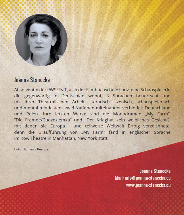 Scheinbar weit entferntes Thema, aber nicht vollständig. Ganz sehr aktuell. Es ist ein aufschlussreicher Versuch, die Geschichte mit einer großen Liebe für einen Mann und wild und wütend auf die politische Propaganda zu schauen, die zu Katastrophen führt. Die Aufführung wird normalerweise auf Deutsch, aber auf Bitte von Viola Kruk-Kadzioch diesmal in polnischer Sprache für das polnische Publikum gespielt. Tickets können unter folgender Telefonnummer gebucht werden: 01723547783.