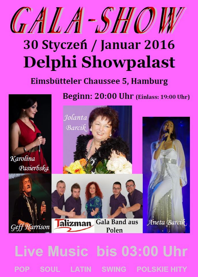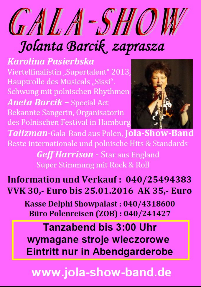 Gala-Show mit Jolanta Barcik findet am 30. Januar ab 20.00 Uhr im Delphi Showpalast (Eimsbüttler Chaussee 5) statt - die schon lange Tradition hat (seit 2003). Die immer gut besuchte Veranstaltung in Rahmen Deutsch-Polnische Freundschaft organisiert die bekannte, seit vielen Jahren in Hamburg lebende, polnische Sängerin Jolanta Barcik zusammen mit ihre Tochter Aneta (auch Sängerin). Damit leisten die beiden Sängerinnen einen wichtigen Beitrag zur Verbreitung der polnischen Kultur in Hamburg. Im Konzert mit Tanzmöglichkeit treten polnische und internationale Künstler auf, die das Publikum von 20:00 Uhr bis 3:00 auf eine wunderschöne Reise mit polnischer Musik der 60-80 Jahre und aktuellen Hits mitnehmen. Die Abendgarderobe ist gewünscht.