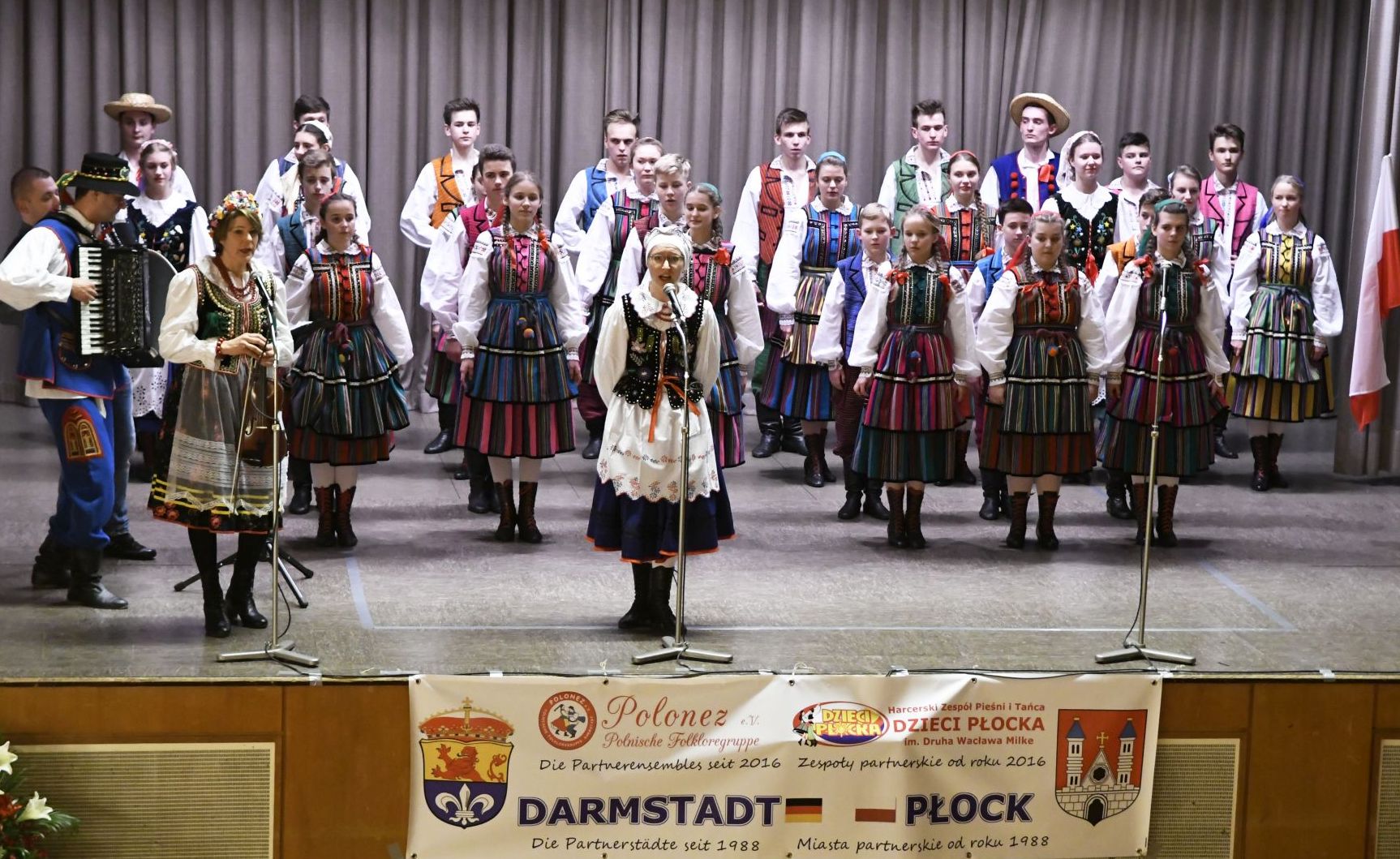 Die Ensembles POLONEZ und DZIECI PŁOCKA arbeiten seit 2 Jahren intensiv zusammen, indem sie Begegnungen und Tanzwerkstätte für Kinder, Jugendliche und Erwachsene sowie gemeinsame Konzerte in den beiden Partnerstädten Płock und Darmstadt veranstalten. Das Jubiläumskonzert war eine gute Gelegenheit, die Ergebnisse dieser Zusammenarbeit zu präsentieren: Die beiden Ensembles tanzten zum ersten Mal zusammen auf der Bühne eine während der Tanzwerkstatt in Płock einstudierten Suite von Rzeszower Tänzen (eine Region um die Stadt Rzeszów im Karpatenvorland) in einer Choreografie für vier Paare, jeweils zwei aus jedem Ensemble.