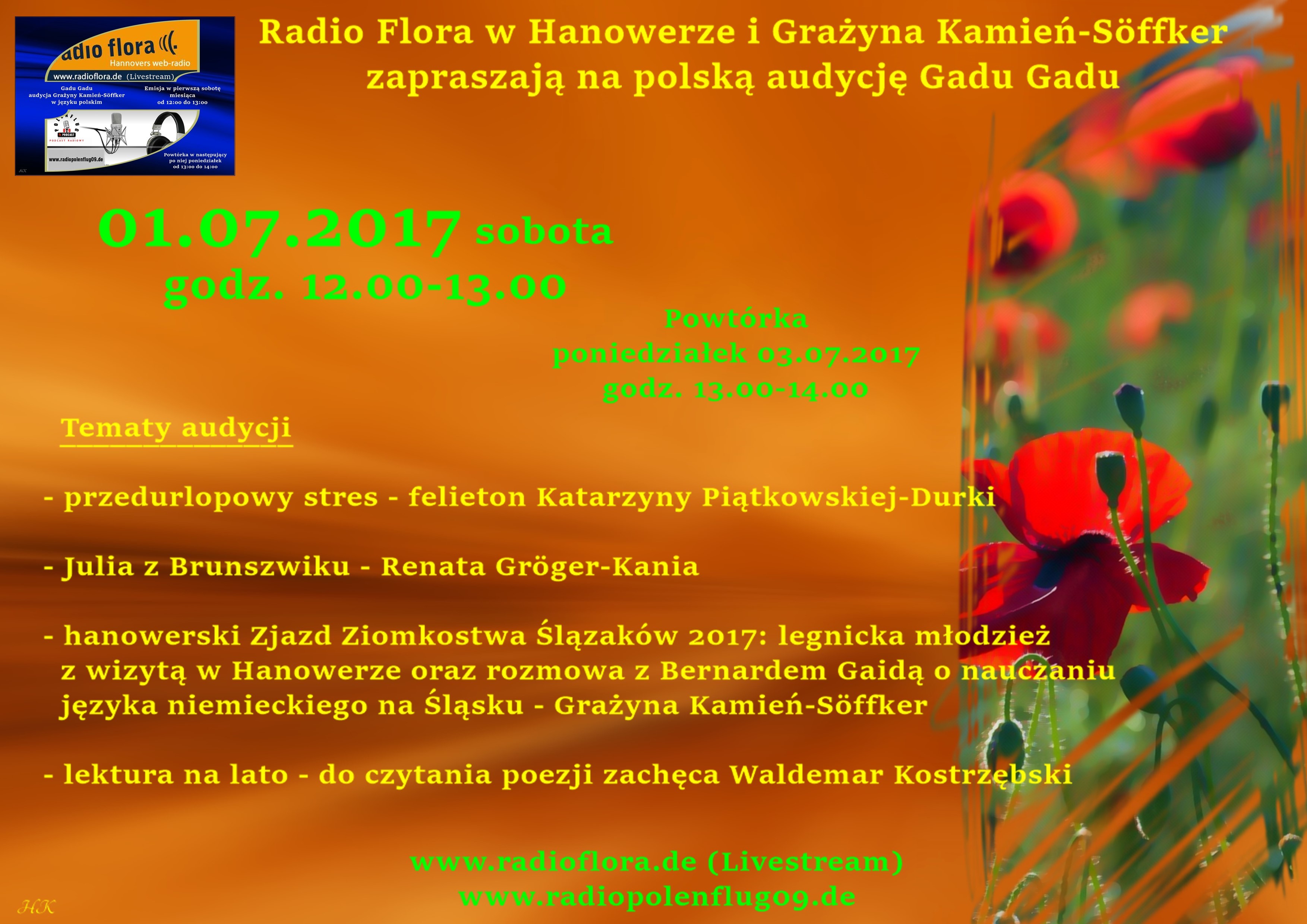 Sendung Gadu Gadu in Radio Flora in Hannover, Juli 2017 Grażyna Kamień-Söffker lädt am 1. Juli 2017, um 12.00 zur polnischen Sendung Gadu Gadu in Radio Flora in Hannover ein. Wiederholung der Sendung wird am Montag, dem 3 Juli 2017 um 13.00 ausgestrahlt.