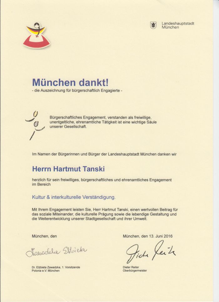 Wiktoria Pałasz – Schülerin der Musikschule in Szczecin in der Klasse des Jazzgesangs verzauberte das Publikum mit einem Lied aus dem Repertoire von Helene Fischer. Dieses Lied hat sie auf die Bitte der Veranstalterin des Konzerts vorbereitet und Hartmut Tanski, Mitglied des Vorstands von Festring München e. V. gewidmet. Hartmut Tanski, ein langjähriger Freund der Gruppe „Polonia“ erhielt aus den Händen von Dr. Elżbieta Zawadzka und dem Bürgermeister der Stadt München Dieter Reiter das Diplom „München Dankt“. Die Übergagabe des Diploms war sehr rührend, weil Wiktoria Pałasz aus Choszczno kommt – aus dem Ort, wo Hartmut Tanski geboren wurde und die Kindheit verbrachte.