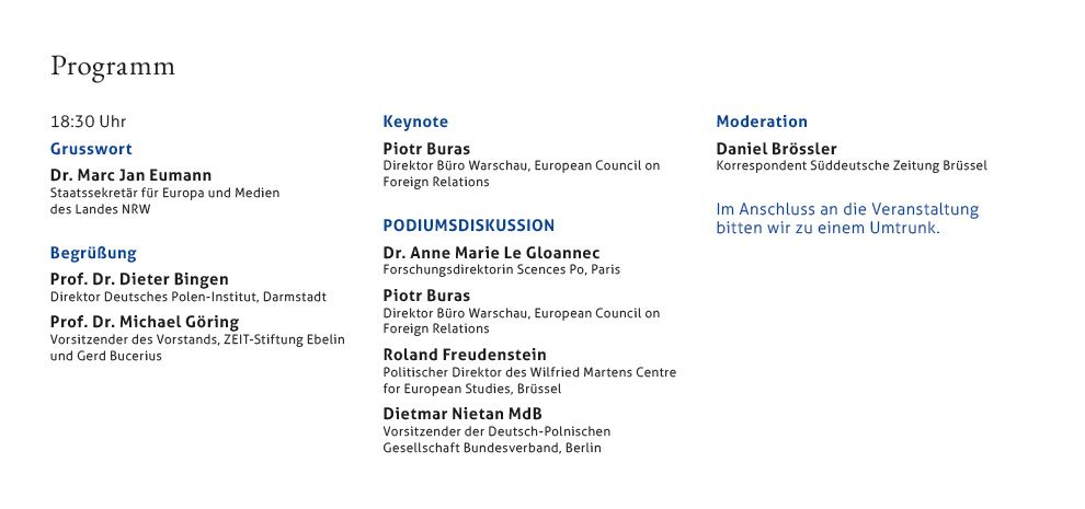 - Das Deutsche Polen-Institut und die ZEIT-Stiftung Ebelin und Gerd Bucerius laden ein zum Podiumsgespräch: