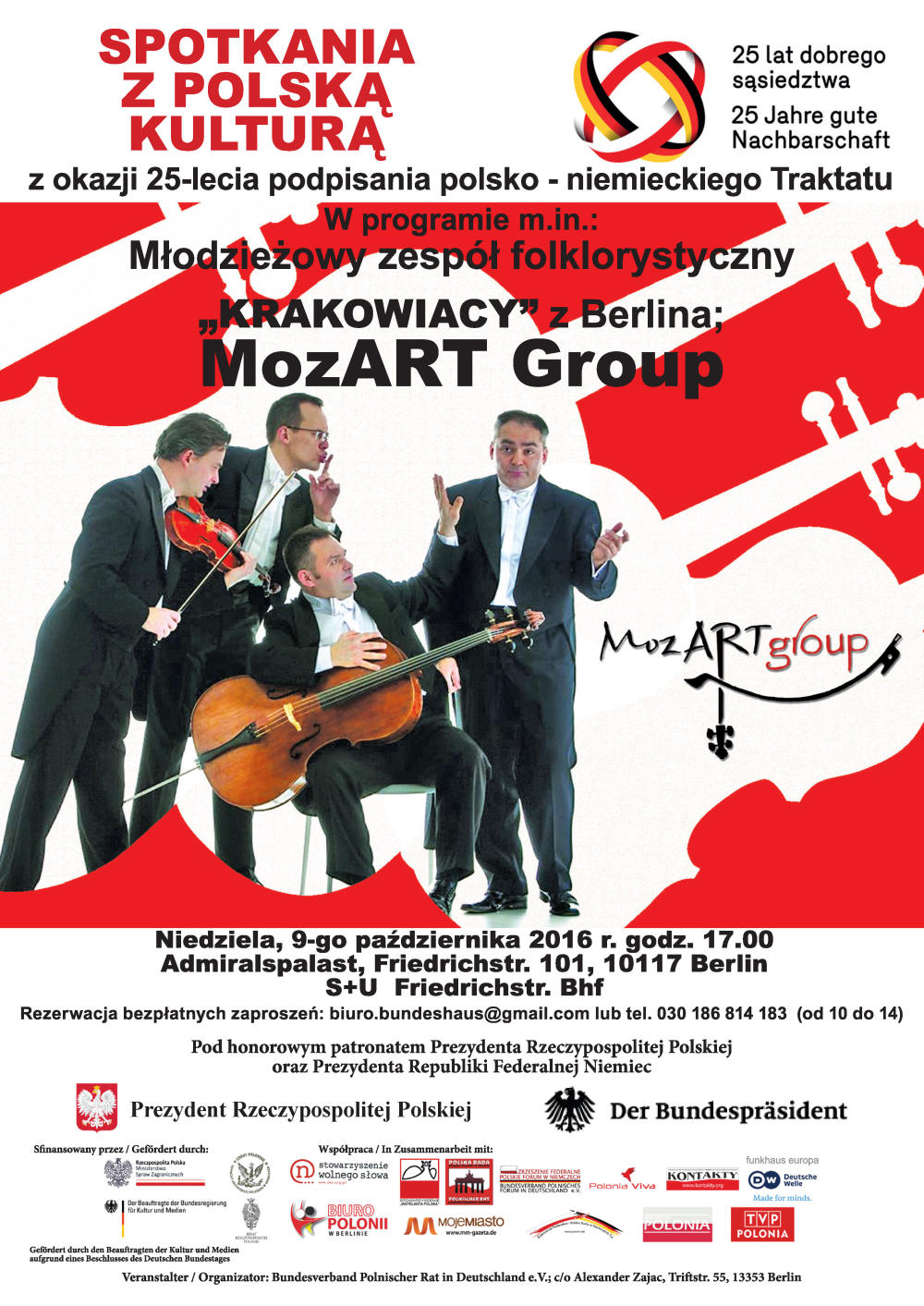Aus dem Anlass des 25-sten Jubiläums der Unterzeichnung des deutsch-polnischen Nachbarschaftsvertrags fanden am Sonntag, 9. Oktober 2016 um 17.00 Uhr im Studio-Admiralspalast in der Friedrichstraße 101 in Berlin die „Begegnungen mit polnischer Kultur“ statt. Im Programm der Veranstaltung gab es zahlreiche Polonia-Akzente – die Jugendgruppe „Krakowiacy“ aus Berlin präsentierte auf der Bühne polnische Tänze. Die Gruppe wird von der Leiterin der Deutsch-Polnischen Europaschule (Katharina Heinroth Grundschule) geleitet. Während der „Begegnungen“ trat auch die Sängerin Iwona Cudak mit ihrer Band „The Crazy Vibes“ auf.