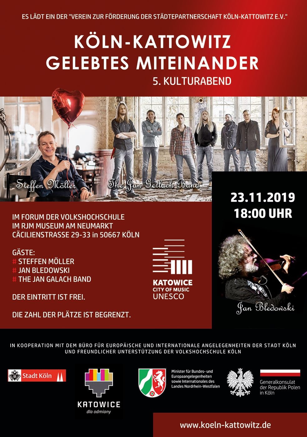 Städtepartnerschaften haben einen festen Platz in den internationalen Beziehungen und sie sind ein wichtiger Faktor bei der Gestaltung von Integrationsprozessen. Alle Vereinbarungen, Verträge und Erklärungen zwischen den Staaten wären bloß Dokumente, die die Unterzeichner zur Einhaltung bestimmter Bestimmungen verpflichten, wenn kein Raum für eine aktive menschliche Tätigkeit bei der Gestaltung des Dialogs auf lokaler Ebene bestehen würde. Diese Aktivität nutzt der "Verein zur Förderung der Partnerstädte Köln-Katowice" e.V. und lädt zum 5. Kulturabends "Köln-Katowice" ein.