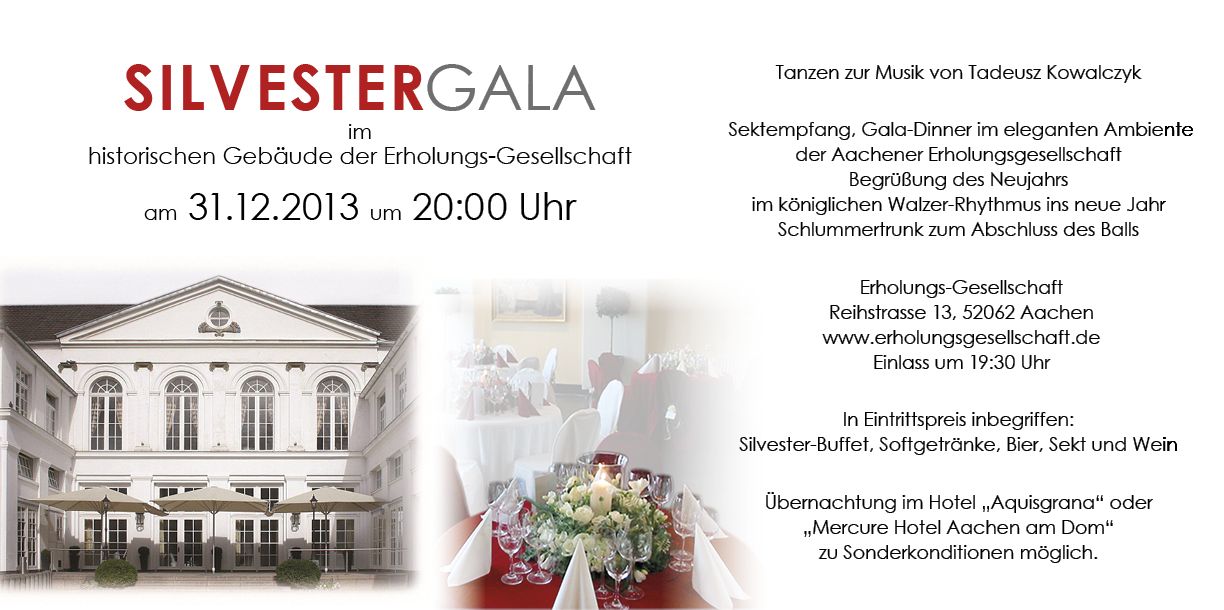 Jak co roku, Polregio organizuje Galę Sylwestrową w pięknej sali balowej w zameczku „Erholungs-Gesellschaft” w samym centrum Aachen, w zachodnich Niemczech. Nie zabraknie na pewno wspaniałej i porywającej do tańca muzyki w wykonaniu znanego w Nadrenii Północnej Westfalii muzyka Tadeusza Kowalczyka i popularnej chansonistki Joli Wolters. Wystarczy więc ubrać wygodne buty i dać ponieść się elektryzującym dźwiękom! Jednak nie samym tańcem człowiek żyje! Catering znowu zapewnia niezastąpiona firma Event Probat. To jej wysiłek cieszy nasze podniebienia i żołądki. Zwłaszcza posiłek w gronie przyjaciół i serdecznych nam ludzi smakuje najlepiej. A na towarzystwo na akwizgrańskim sylwestrze narzekać nie można! To wszystko nastroi bardzo pozytywnie i pozwoli nam wkroczyć w Nowy Rok z uśmiechem na ustach i zadowoleniem w sercu!