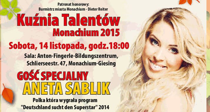 Koncert galowy pt. Kuźnia Talentów Monachium 2015, odbędzie się w sobotę, 14 listopada, o godz. 18.00, w sali Anton - Fingerle - Bildungszentrum, Schlierseestr.47, Monachium Giesing. W koncercie wezmą udział młodzi, utalentowani artyści z Polski i z Niemiec.Gościem specjalnym będzie polska wokalistka - Aneta Sablik, która oczarowała niemiecką widownię wygrywając popularny program telewizyjny "Deutschland sucht den Superstar".