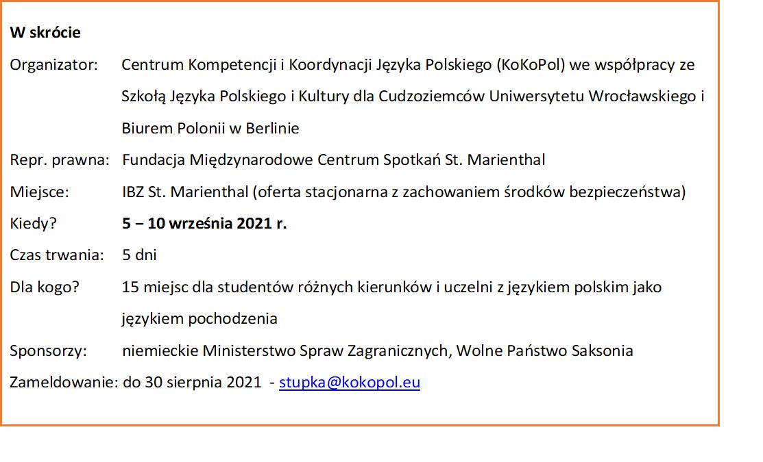 Początek września w St. Marienthal w Saksonii: dojrzewające jabłka, szemrząca Nysa, późne letnie słońce w ogrodzie roślin biblijnych. W ciągu zaledwie jednego tygodnia możesz podnieść swoją wyniesioną z domu polszczyznę do poziomu akademickiego, nawiązać nowe znajomości i naładować akumulatory na nowy semestr. Oferta (30 godzin lekcyjnych, ekscytujący program wieczorny, 5 noclegów i pełne wyżywienie) jest dostępna bezpłatnie dla studentów wszystkich kierunków.