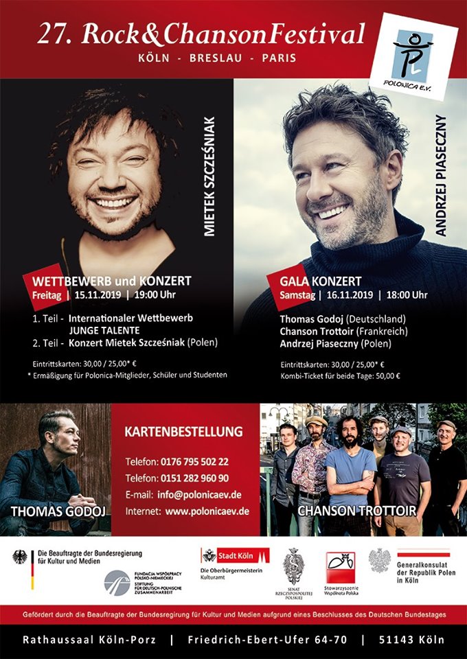 Liebe Musikfreunde, das 27. Rock&ChansonFestival „Köln-Breslau-Paris“ findet vom 15. bis 16. November 2019 im Rathaussaal Köln-Porz statt. Wir garantieren musikalischen Hochgenuss sowie beste Unterhaltung mit hervorragenden Künstlern aus Deutschland, Frankreich und Polen, und bieten Ihnen an zwei Abenden die perfekte Gelegenheit , an einem faszinierenden Musikerlebnis teilzunehmen.