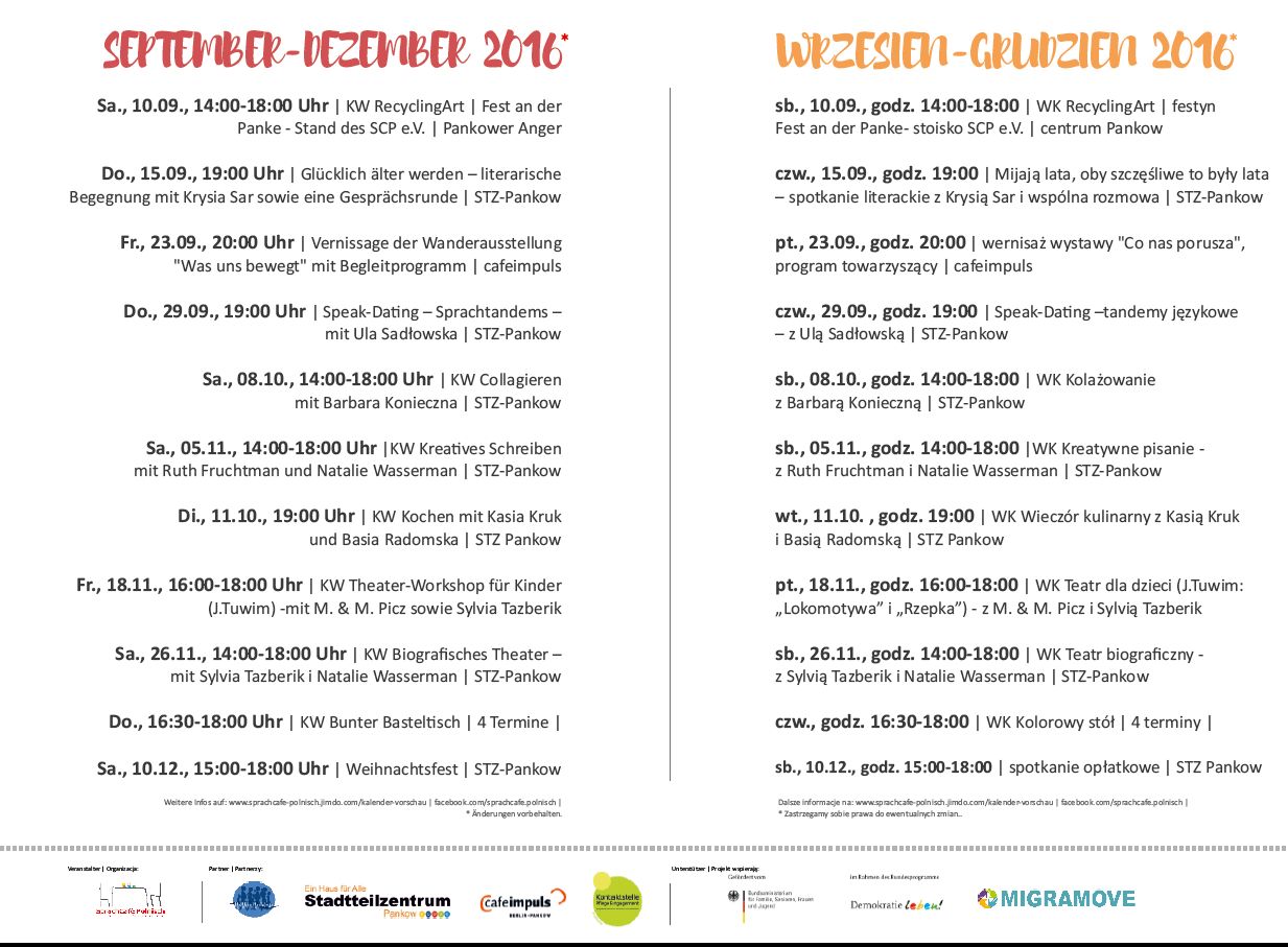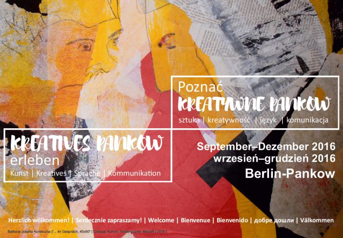 Schon ab September 2016 bis Ende des Jahres laden das SprachCafè Polnisch e.V und Partner ganz herzlich zu einem neuen Projekt KREATIVES PANKOW erleben ein. Im Mittelpunkt des Projektes stehen Kunst und kreative Aktivitäten sowie Sprache und Kommunikation, die das Zusammenkommen und Austausch der Menschen sowohl im Bezirk Pankow wie auch berlinweit unterstützen sollen. Angesprochen werden aktive und Interessierte Teilnehmer*Innen, Alt- und Neu-Berliner*Innen, Kinder und Erwachsene. Mit dem Projekt wollen wir die Vermittlung und Kultivierung demokratischer Werte und Toleranz sowie gelebte Nachbarschaft unterstützen.