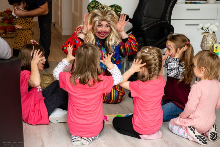Die Leiterin der Akademie, Weronika Lubezna Gruba, verkleidet sich als Clown, der die Jüngsten unterhält, während ihre Eltern den Schweiß wegwerfen.