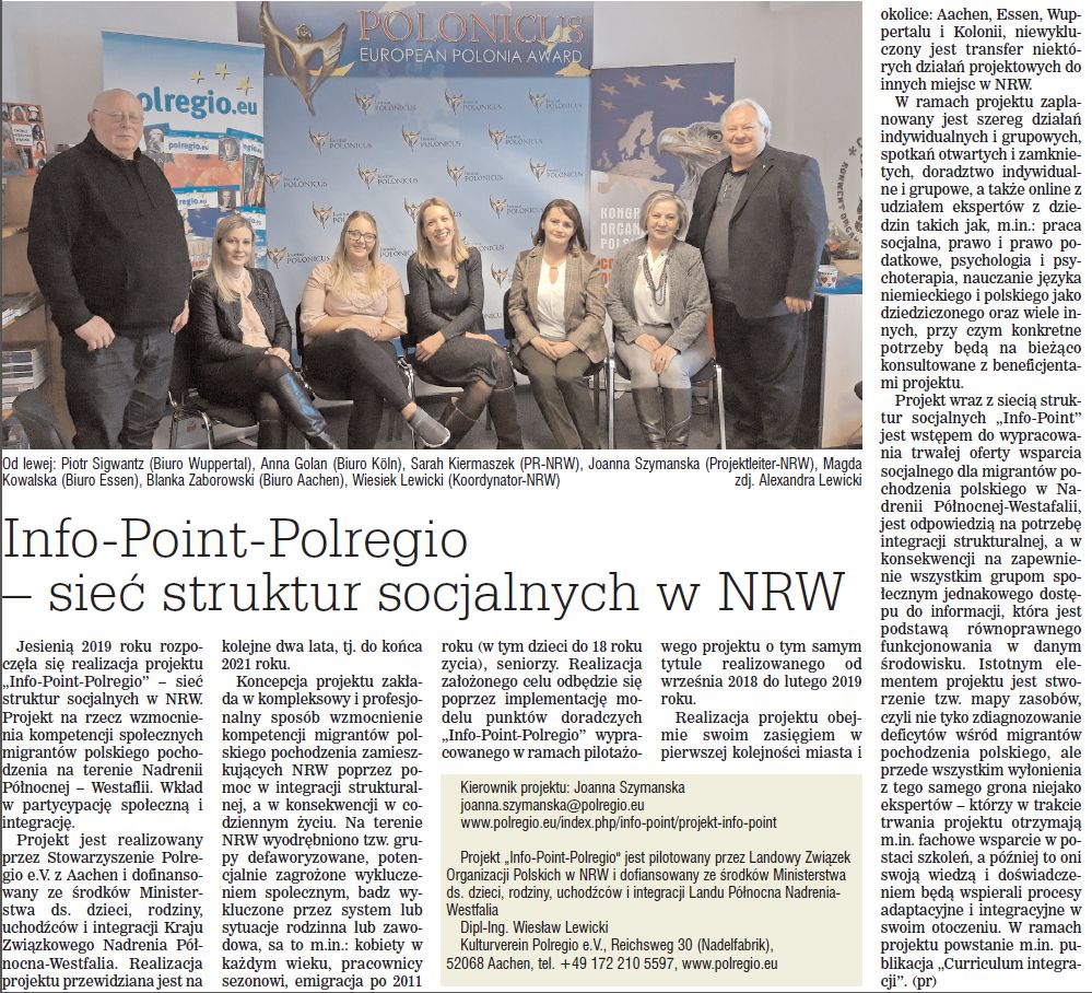 Projekt "Info-Point-Polregio" - ein Netzwerk sozialer Strukturen in Nordrhein-Westfalen. Projekt zur Stärkung der sozialen Kompetenzen von Migranten polnischer Herkunft in Nordrhein-Westfalen. Das Projekt zur sozialen Teilhabe und Integration, wurde Mitte September dieses Jahres gestartet, seine Umsetzung wird bis Ende 2021 dauern. Die vier Monate des Projekts waren eine Zeit intensiver Arbeit, insbesondere im Team. Es geht um den Aufbau einer Projektstrategie, die Erstellung von Projektunterlagen, Training und Teamarbeit - ständiger Informationsaustausch und die Suche nach institutionellen Partnern.