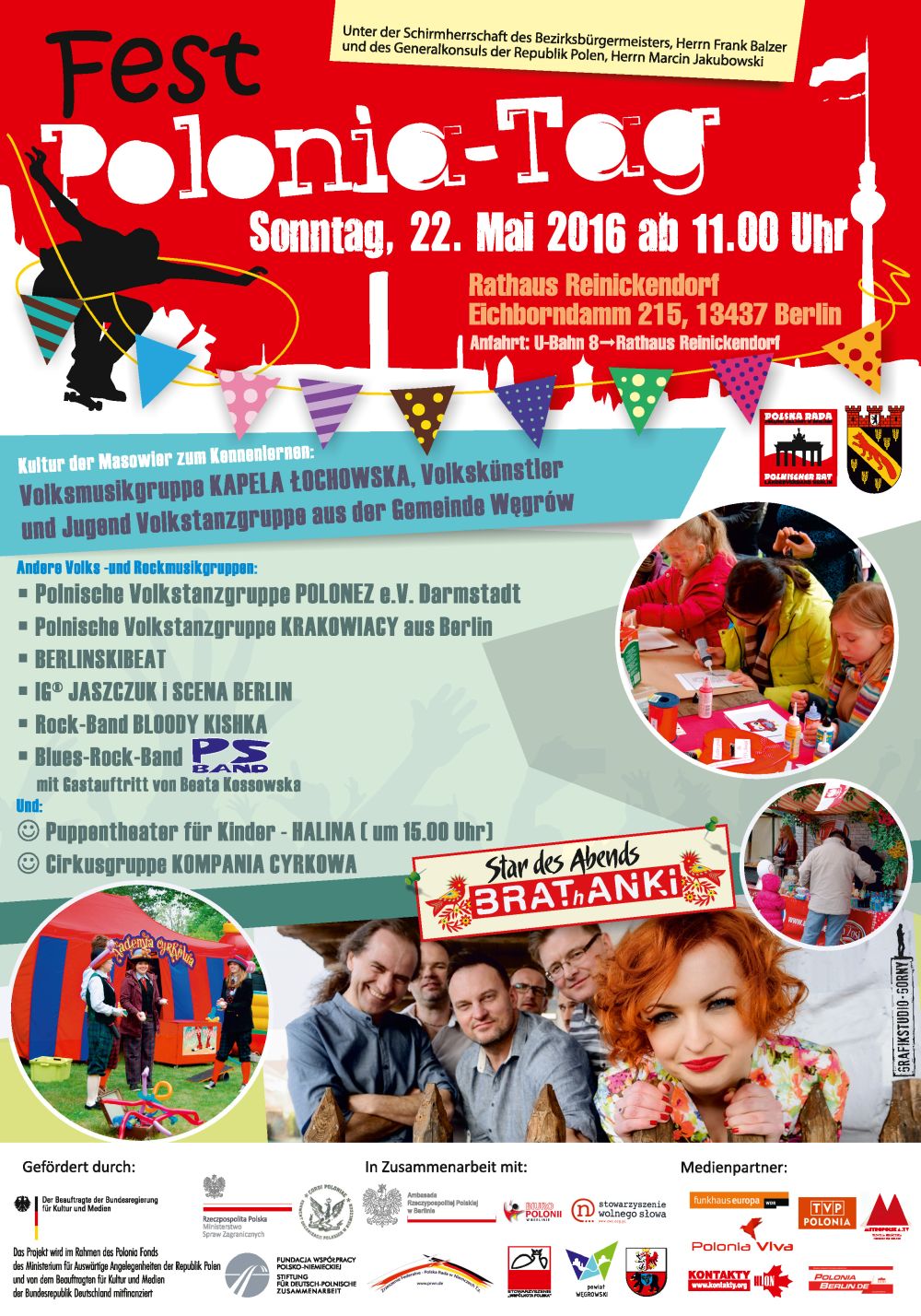 Jedes Jahr lädt Polonia in Berlin auf eigenes Festyn "Tag der Polonia" dismal am Sonntag den 22. Mai ab 11.00 Uhr im Rathaus Renickendorf. In diesem Jahr zu Gast haben wir Folklorgruppen aus Masowen. Program und Kunstler sind auf der Plakate zu fiinden.