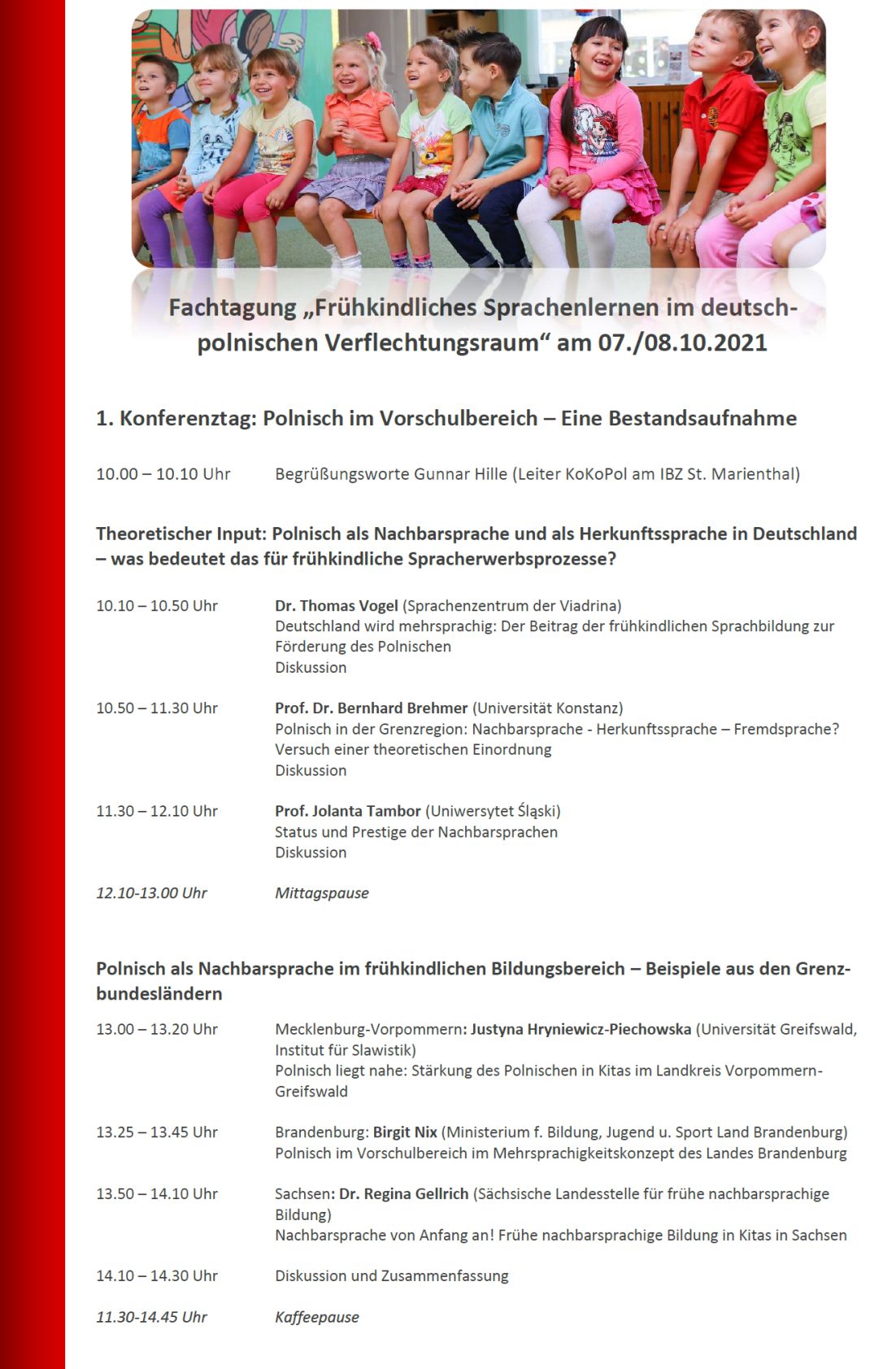Sehr geehrte Damen und Herren, anbei sende ich Ihnen das aktualisierte Programm für die Fachtagung „Frühkindliches Lernen im deutsch-polnischen Verflechtungsraum“, die KoKoPol in Kooperation mit der Sächsischen Landesstelle für nachbarsprachige Bildung (LaNa) vom 07. bis zum 08.10.2021 am Internationalen Begegnungszentrum St. Marienthal organisiert. Vorgestellt und diskutiert werden Modelle und Best-Practice-Beispiele früher nachbarsprachiger Bildung aus Sachsen, Brandenburg und Mecklenburg-Vorpommern ebenso wie Konzepte anderer Bundesländer ohne direkte Grenzlage, jedoch mit großer Anzahl polnischer Herkunftssprachler*innen.