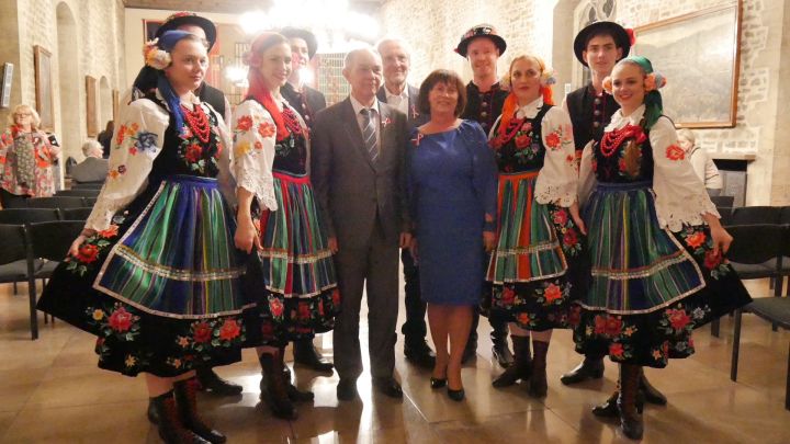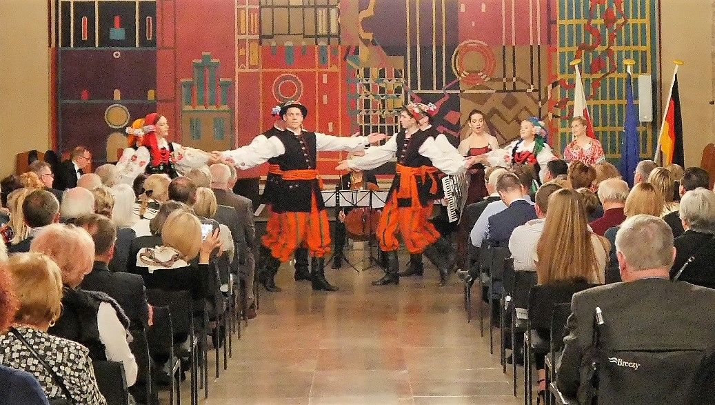 Polen ist ein Land der Musik, die heiße Spuren in der Seele hinterlässt, betonte die Moderatorin Frau Dr. Ewa Herfordt mehrfach im Verlauf des Abends. In dieser Hinsicht warteten auf unsere Gäste in der Tat viele hochemotionalen Momente. Musikalisch begrüßt wurden sie vom deutsch-polnischen Oginski-Ensemble, das von dem Braunschweiger Komponisten und Dirigenten Herrn Bernfried E. G. Pröve geleitet wurde. Zur „Polonaise A-Moll“ von Michał K. Ogiński voller Anmut getanzt, in traditionellen Trachten der Region „Lowicz“, haben die jungen Tänzer und Tänzerinnen der Folkloregruppe „Polonia“ e.V. aus Hannover (Leitung Charlotte Glowacka).