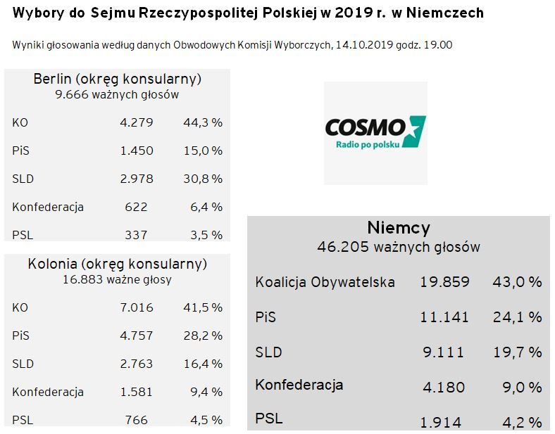 So haben die Polen in Deutschland gewählt. In Wahlbezirken in Deutschland wurde die überwiegende Mehrheit der Stimmen auf der Liste der Bürgerkoalition abgegeben. Die Democratic Left Alliance hatte ebenfalls ein großartiges Ergebnis.