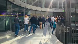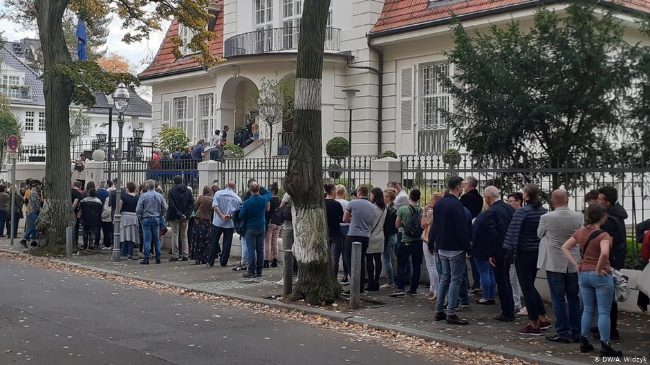 Eine lange Schlange vor der polnischen Botschaft in Berlin und vor dem Generalkonsulat in Köln