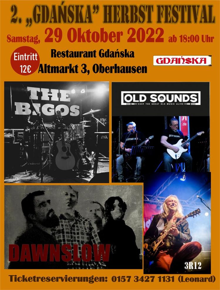 Am Samstag, den 29. Oktober, werden 4 Bands auf der "Danzig"-Bühne auftreten, die Musik im Grenzbereich zwischen Blues und Rock spielen. Die erste Band wird bereits um 18 Uhr die Bühne betreten. Die Band The Bigos aus Hannover wird zum ersten Mal in Oberhausen zu sehen sein. Außerdem treten das Blues-Duo Old Sounds aus Velbert und die mit dem polnischen Publikum befreundete Alternative-Rock-Instrumentalband Dawnslow auf. Beim letzten Festival wurde die Band vom Publikum u. a. für ihre hervorragenden Gitarren- und Querflötensoli gelobt. Es ist das vierte Mal, dass Dawnslow bei der polnischen Veranstaltung in "Gdańsk" auftritt.
