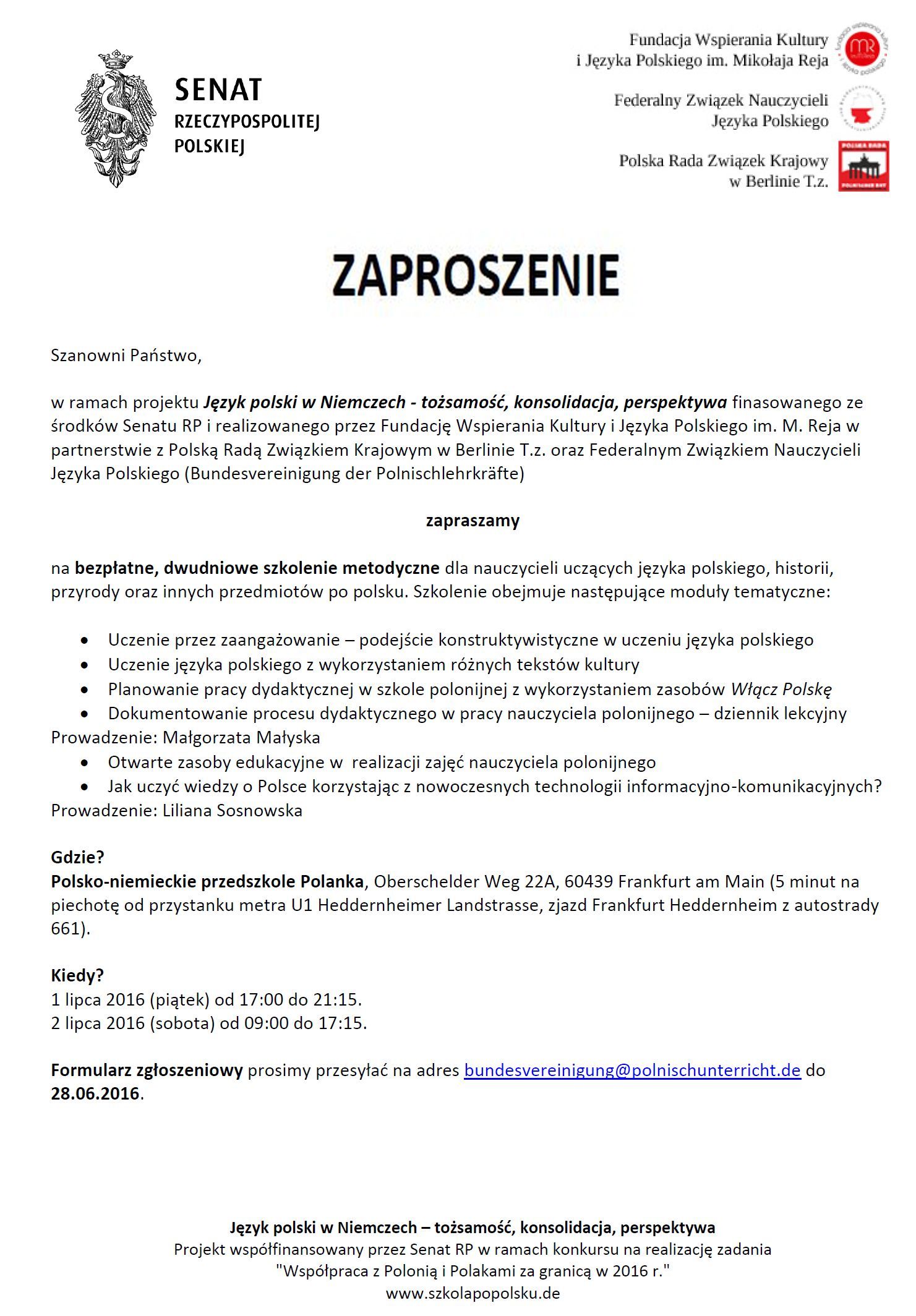 Alle Lehrer die Interesse an der Zusammenarbeit bei der Umsetzung des Projekts "Polnische Sprache in Deutschland - Identität Konsolidierung, die Aussicht auf" haben, laden wir am Freitag und Samstag, den 1. und 2. Juli 2016 herzlichst ein. Es ist die weitere informative und bildende Sitzung (Einladung und Programm im Anhang) nach Frankfurt (Adresse: polnisch-deutschen Kindergarten Polanka, Oberschelder Weg 22A, 60439 Frankfurt am Main).