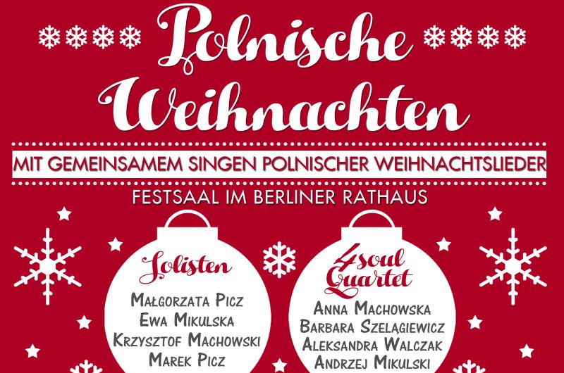 Das Konzert wird am 9.12. 2015 im Festsaal im Roten Rathaus stattfinden und wird von 4 Opernsängern, 4 Soul Quartet, Berliner Tanzgruppe "Krakowiacy" und Iwona Cudak and Friends durchgeführt. Die musikalische Begleitung erfolgt durch den Pianisten Przemek Winnicki, sowie dem Streichquartett "4 Soul Quartet".