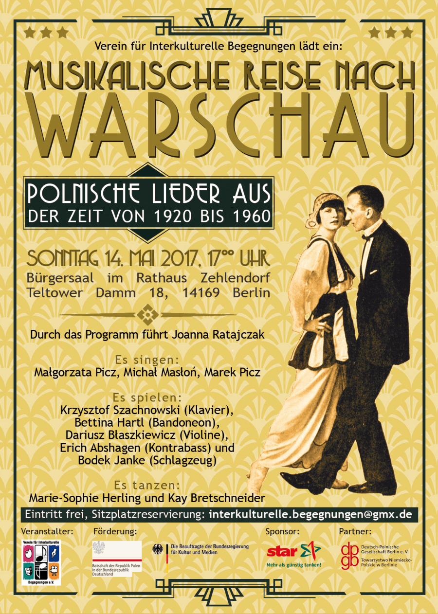 "Musikalische Reise nach Warschau" - Polnische Lieder aus der Zeit von 1920 bis 1960. Sonntag, 14.05.2017, 17.00 Uhr, Bürgersaal im Rathaus Zehlendorf, Teltower Damm 18, 14169 Berlin.