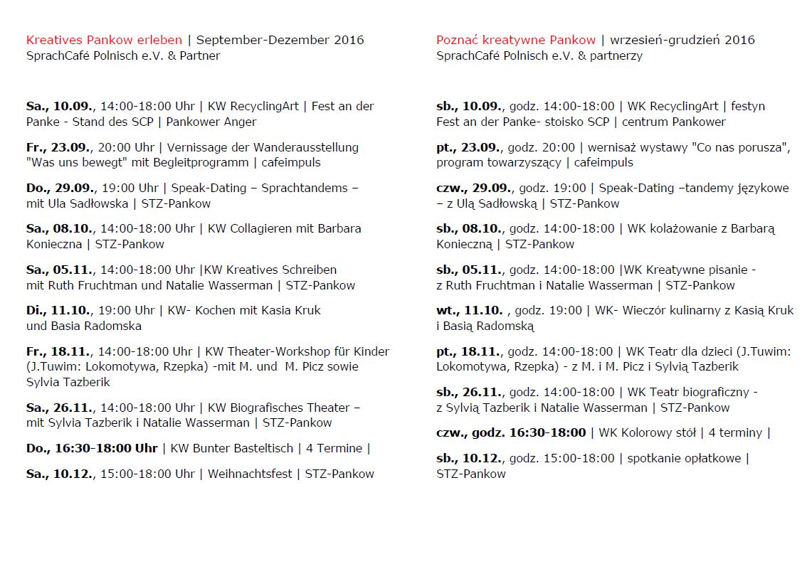 Schon ab September 2016 bis Ende des Jahres laden das SprachCafè Polnisch e.V und Partner ganz herzlich zu einem neuen Projekt KREATIVES PANKOW erleben ein. Im Mittelpunkt des Projektes stehen Kunst und kreative Aktivitäten sowie Sprache und Kommunikation, die das Zusammenkommen und Austausch der Menschen sowohl im Bezirk Pankow wie auch berlinweit unterstützen sollen. Angesprochen werden aktive und Interessierte Teilnehmer*Innen, Alt- und Neu-Berliner*Innen, Kinder und Erwachsene. Mit dem Projekt wollen wir die Vermittlung und Kultivierung demokratischer Werte und Toleranz sowie gelebte Nachbarschaft unterstützen.