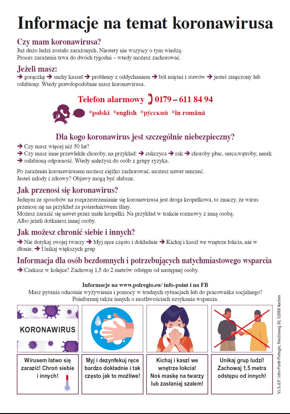 Nachstehend finden Sie Informationen über die Vorgehensweise in den nächsten Wochen im Zusammenhang mit der Covid-19-Pandemie. Die Informationen werden in polnischer Sprache bereitgestellt. Das Faltblatt enthält eine Notrufnummer, die auf Polnisch, Deutsch, Englisch, Russisch und Rumänisch geführt wird. Das Faltblatt ist druckfertig. Es kann daher sowohl in gedruckter Form als auch online eingereicht und verteilt werden.