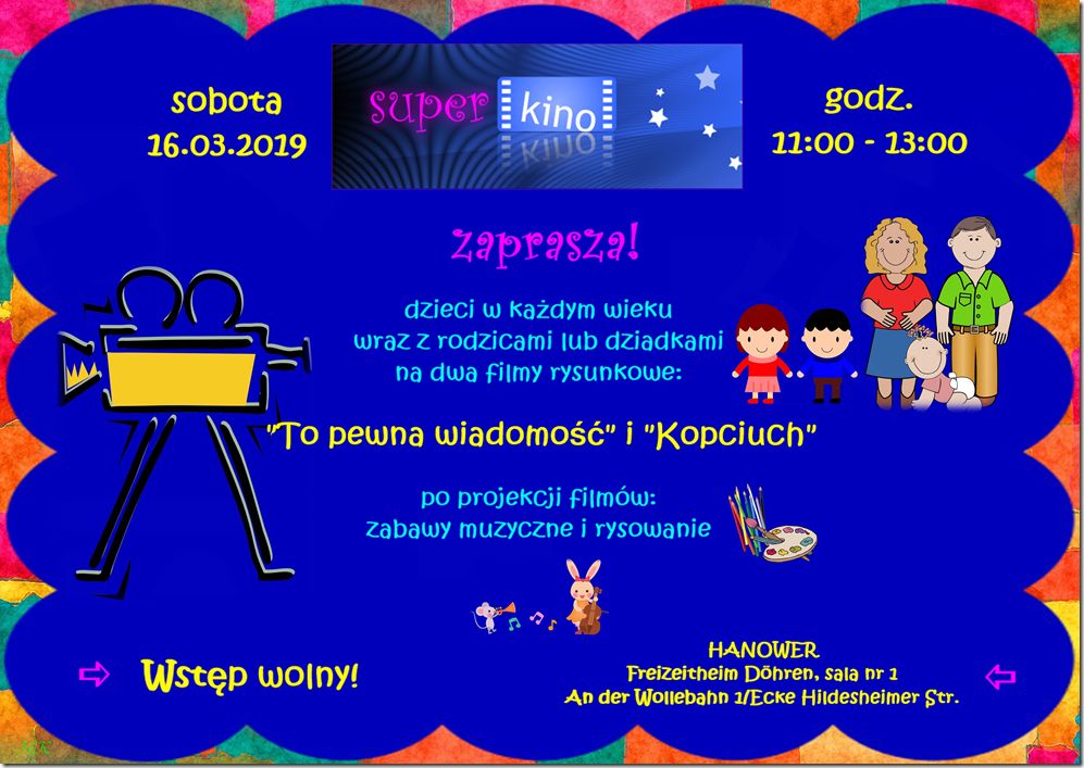 Super Kino! zaprasza dzieci z Hanoweru i okolic na dwa filmy rysunkowe: "To pewna wiadomość" i "Kopciuch". Po projekcji wspólne zabawy muzyczne i rysowanie. Wszystkie dzieci mile widziane. Wstęp wolny!