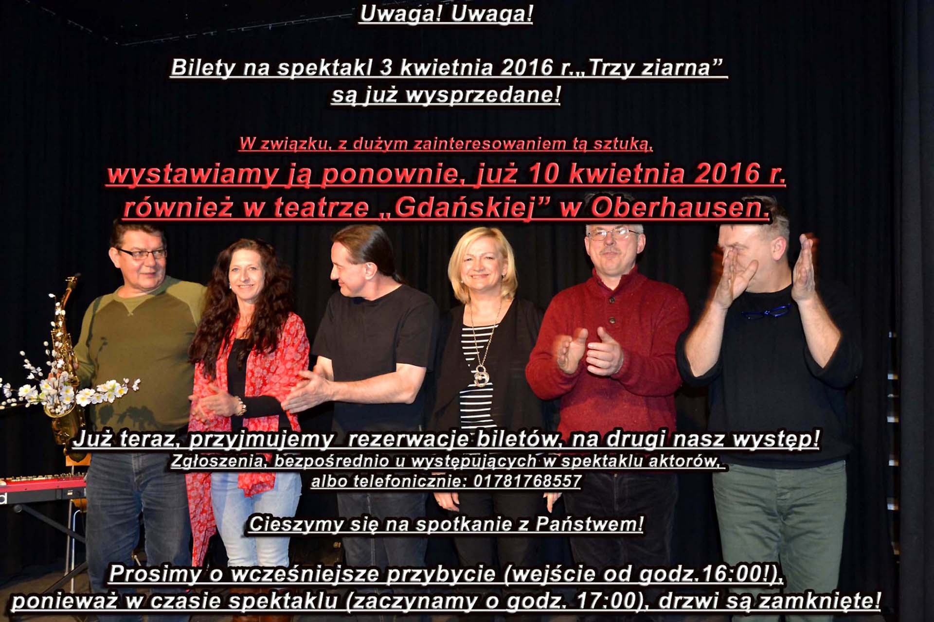 Aufgrund des großen Interesses unserer Theaterstück "Drei Körner" freuen wir uns es zu verkünden, dass obwohl Tickets für die Show am 3. April 2016. sind bereits ausverkauft, aber vor allem für diejenigen, die aus dem Urlaub in Polen oder von Frühlingsurlaub zurückkehren, wird Sonderausgabe "Drei Körner" im Theater "Danzig" - Altmarkt 3 46045 Oberhausen,