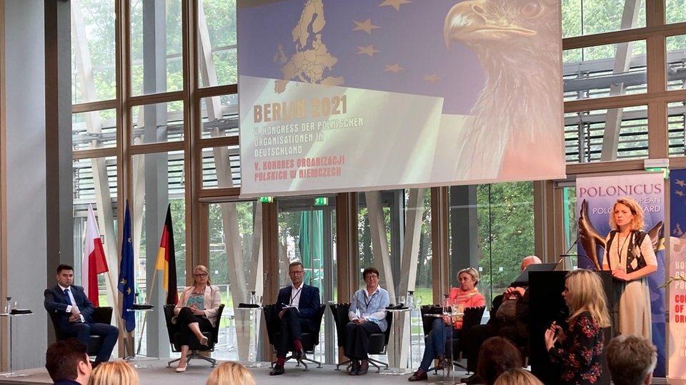 Es folgte eine Podiumsdiskussion mit Vertretern der Polonia, darunter Hans-Leo Dirks, der Bundesbeauftragte für Auslandspolen, Katarina Niewiedzial, die Beauftragte des Berliner Senats für Integration und Auswanderung, Anett Roswora, die Thüringer Beauftragte für Integration, Auswanderung und Flüchtlinge und Thorsten Klute, der Beauftragte für Polonia in Nordrhein-Westfalen.