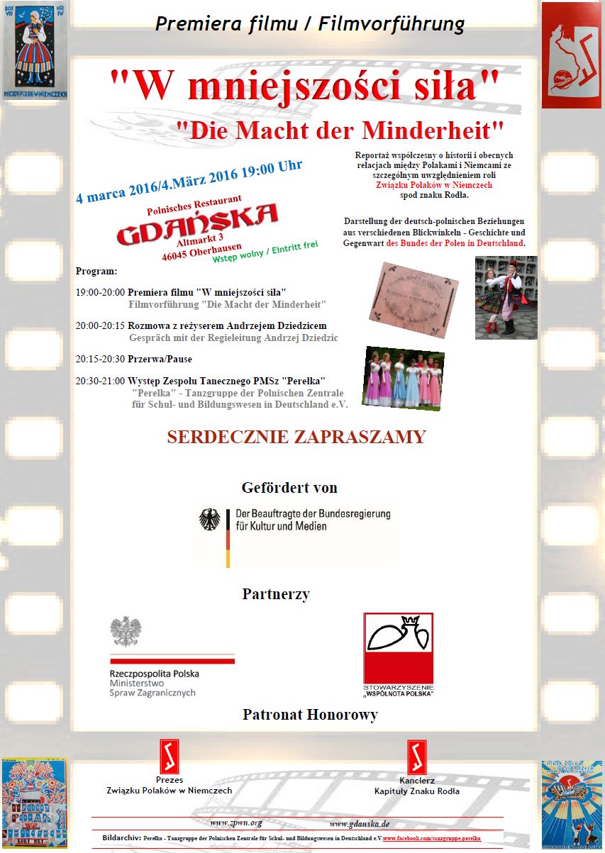 Am kommenden Freitag, den 4. März um 19.00 Uhr in der Kult-Szene "Gdanska" in Oberhausen sind Sie härzlichst zu der Premiere des Films "Die Macht der Minderheit" engeladen. Der Film berührt die moderne Geschichte der Beziehungen zwischen Deutschen und Polen, die seit Generationen in Deutschland leben.