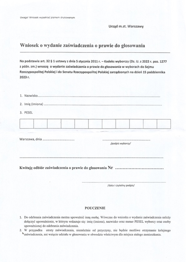 Der Antrag auf Erteilung einer Bescheinigung kann bei jedem Gemeindeamt in ganz Polen oder bei einem Konsulat gestellt werden. Herr Joachim Białas prüfte diese Möglichkeit, eine Bescheinigung über das Wahlrecht im Ausland zu erhalten. Er buchte einen Termin beim Konsulat in München in der Abteilung "Recht und Bürgerliche Angelegenheiten", beantragte zum vereinbarten Termin im Konsulat und erhielt eine solche Bescheinigung "sofort" kostenlos. Auch ich habe diese Möglichkeit in Polen geprüft. Ich ging zum nächstgelegenen Gemeindeamt, in meinem Fall war es das Gemeindeamt von Warszawa Targówek, und nachdem ich ein einfaches Formular ausgefüllt hatte, das als Beispiel unter dem Artikel aufgeführt ist, erhielt ich eine Bescheinigung, die mich dazu berechtigte, in jedem beliebigen Wahllokal zu wählen. Diese Bescheinigung wird nur bis zum 12. Oktober 2023 ausgestellt.