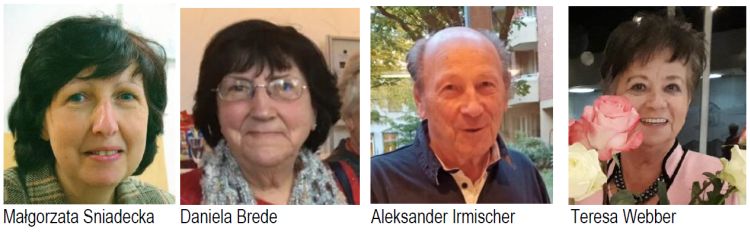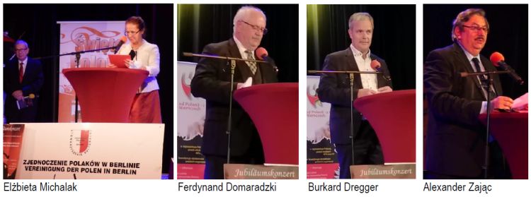 Die Vorsitzende der Vereinigung Frau Elżbieta Michalak begrüßte die geladenen Gäste und dankte der Geschäftsstelle der Polonia in Berlin sowie dem Polnischen Rat Landesverband Berlin für die Unterstützung bei der Durchführung der Jubiläumsfeierlichkeiten. Der Geschäftsführer des Polonia-Büros Herr Alexander Zając und der Vorsitzende des Polnischen Rates in Berlin Herr Ferdynand Domaradzki wurden mit Diplomen der Vereinigung ausgezeichnet. Weitere Danksagung und Worte voller Herzlichkeit wurden an die ständigen Mitglieder der Vereinigung gerichtet, deren Haltung alle zum aktiven Handeln motiviert. Besonderer Dank wurde den Vorstandsmitgliedern ausgesprochen: Małgorzata Śniadecka, Daniela Brede, Aleksander Irmischer und Teresa Weber, als auch den anderen Vereinsmitgliedern für ihren Einsatz und ihr Engagement, die wöchentlichen Treffen, die immer einen festlichen Charakter haben, abwechslungsreich zu gestalten. Auch die ältesten Mitglieder der Vereinigung wurden erwähnt. Den ehemaligen Vorsitzenden Jan Wache, Henryk Olkiewicz, Jan Mieszkalski, Bolko Kliemek, Bogdan Stróżyński und Józef Dunst wurde die Ehrenmitgliedschaft der Vereinigung verliehen. Für die langjährige Tätigkeit in der Vereinigung wurden ausgezeichnet: Małgorzata Wietteck, die in diesem Jahr ihre 50-jährige Mitgliedschaft feiert, und Daniela Brede; beiden wurde ebenfalls der Titel eines Ehrenmitgliedes zuerkannt.