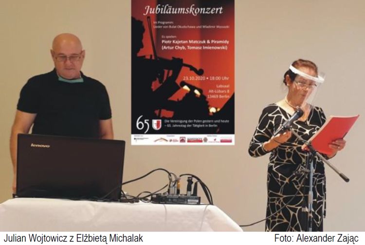 Am Freitag, den 23. Oktober 2020, fand im Labsaal in Berlin-Lübars das Jubiläumskonzert statt. Leider konnten wegen der Einhaltung der Abstandvorschriften nur 80 Personen das Konzert verfolgen. An der Veranstaltung nahmen teil: Burkard Dregger - Vorsitzender der CDU-Fraktion im Berliner Abgeordnetenhaus, Ferdynand Domaradzki – Vorsitzender des Polnischen Rates Landesverband Berlin und Alexander Zając – Geschäftsführer der Geschäftsstelle der Polonia in Berlin, die an die Versammelten Grußworte gerichtet haben. Zu Händen der Vorsitzenden Elżbieta Michalak hat Herr Alexander Zając, Vorsitzender des Konventes der Polnischen Organisationen in Deutschland, Glückwünsche des Senators Wojciech Ziemniak und der Sejm-Abgeordneten Joanna Fabisiak übermittelt. Die Vorsitzende Elżbieta Michalak hat sich bei allen geladenen Gästen für ihr Kommen bedankt, präsentierte die wichtigsten Errungenschaften und stellte die ausgezeichneten Mitglieder der Vereinigung der Polen in Berlin vor. Sie bedankte sich bei der Beauftragten der Bundesregierung für Kultur und Medien sowie beim Bundesverband Polnischer Rat in Deutschland e.V. für die finanzielle Förderung des Projektes und bei Alexander Zając und Ferdynand Domaradzki für die Unterstützung bei der Organisation der Jubiläumsveranstaltung . Den nachfolgenden Programmpunkt bildete eine multimediale Präsentation der Geschichte der Vereinigung, die Jerzy Górny vorbereitet hat. 20 Minuten lang haben sich die Anwesenden mit der reichhaltigen Geschichte vertraut gemacht, sich an Mitglieder der Vereinigung erinnert, an Autorallyes, an das von Bonifacy Stopa verfasste Zeitungsblatt „Gazetka“, an Bälle, Konzerte, Pilzexkursionen und andere gemeinsame Ereignisse, die der Pflege der polnischen Tradition, der Sprache und Kultur dienten und zum Aufbau der polnischen Gemeinschaft im Ausland beitrugen.
