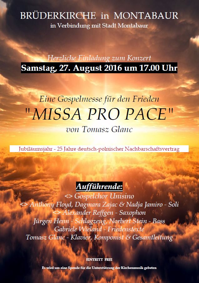 In diesem Sinne möchten wir Sie ganz herzlich zu einem besonderen Konzert der "MISSA PRO PACE" einladen, das mit Unterstützung der Stadt Montabaur am Samstag, dem 27.August 2016 um 17 Uhr in der Brüderkirche zu Montabaur stattfindet . Mit dieser lateinischen Gospel-Friedensmesse für Chor, Soli, Sprecher & Quartett, die von Tomasz Glanc komponiert wurde, möchten wir unser Zeichen der guten deutsch-polnischen Beziehungen in unserer Region setzen und gleichzeitig an den Frieden in der Welt appellieren .