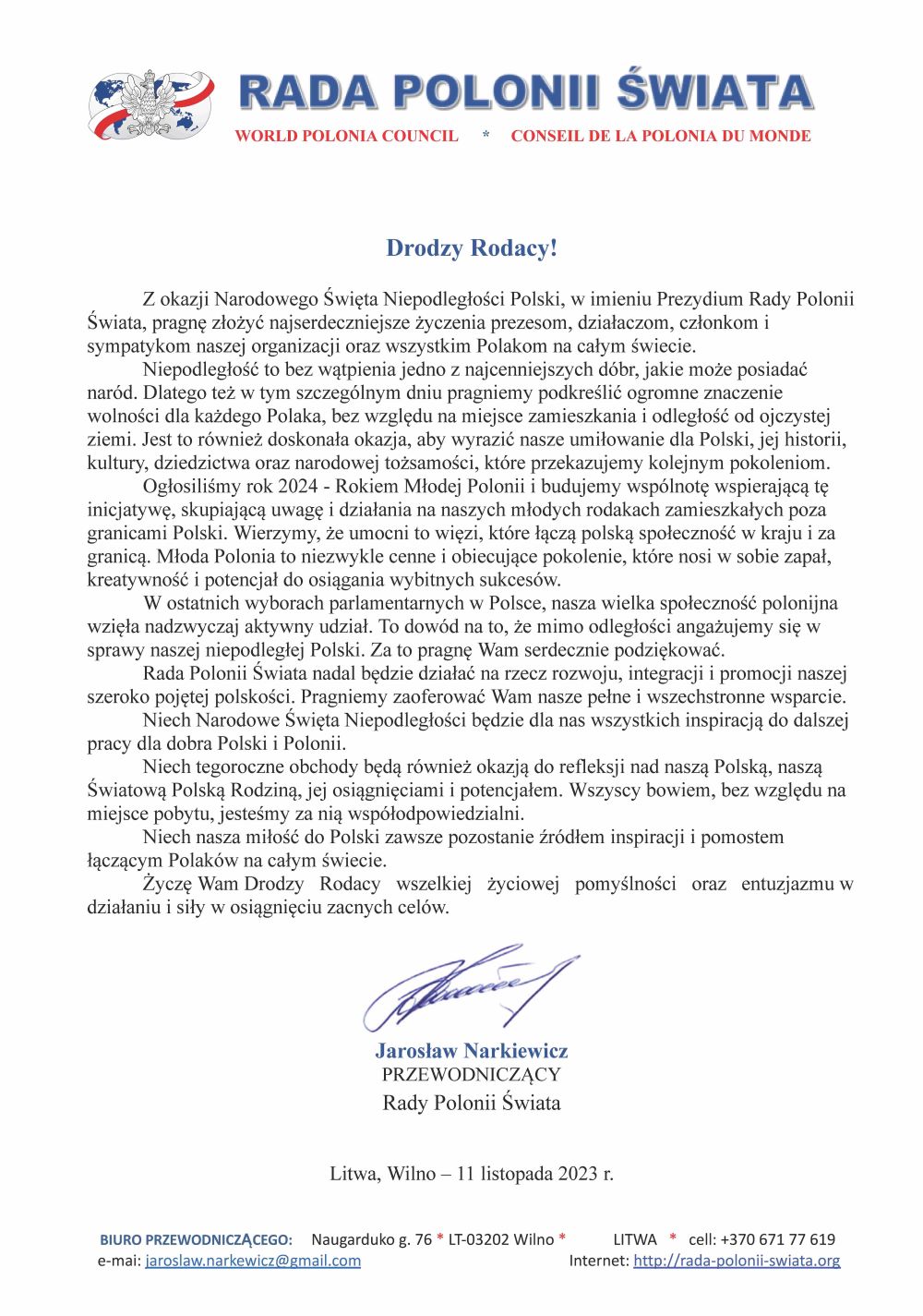 Polonia Niemiecka otrzymała z okazji Święta Niepodległości list od Jarosława Narkiewicza – Przewodniczącego Rady Polonii Świata.
