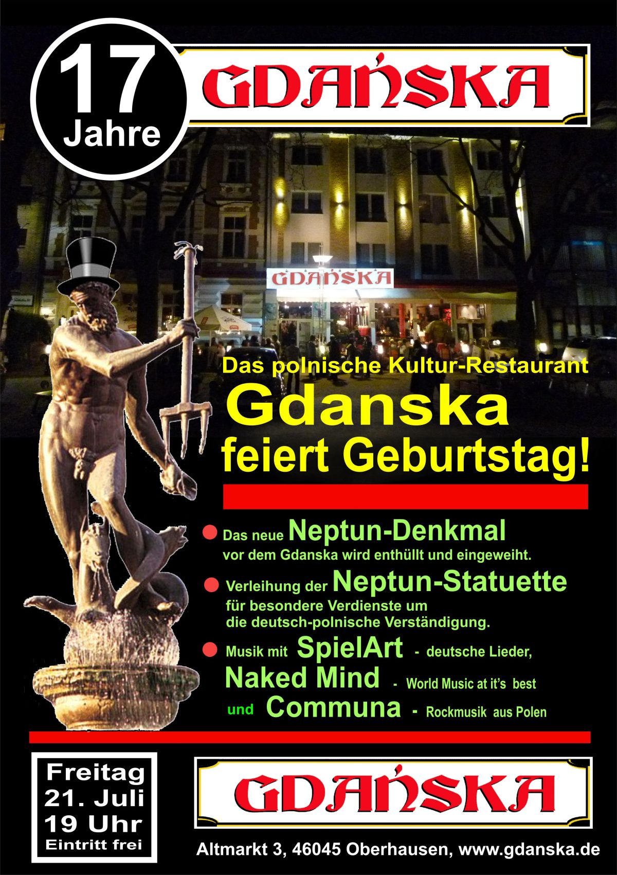 W nawiązaniu do 17-tej rocznicy powstania naszej „Gdańskiej“, będą rozdane statuetki Naptuna dla tych, którzy szczególnie zasłużyli się dla niemiecko-polskiego porozumienia. w dniu 21.07.2017 o godz. 19 statuetki będą wręczone długoletniemu Citymanagerowi miasta Oberhausen Franzowi Muckel oraz stowarzyszeniu PIAST – Gmina Polska w Essen. Impreza zaplanowana jest zarówno przed jak i w pomieszczeniach restauracji "Gdańska". Imprezę urozmaici projekt muzyczny AKED MIND.