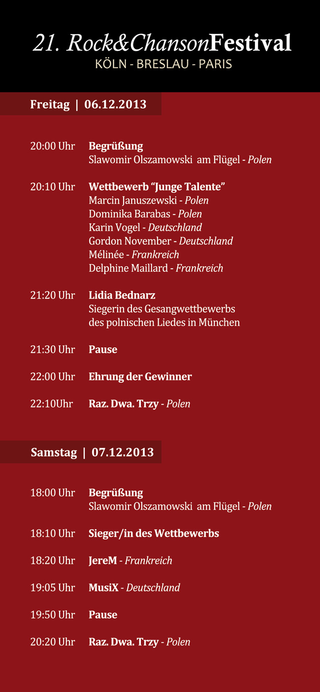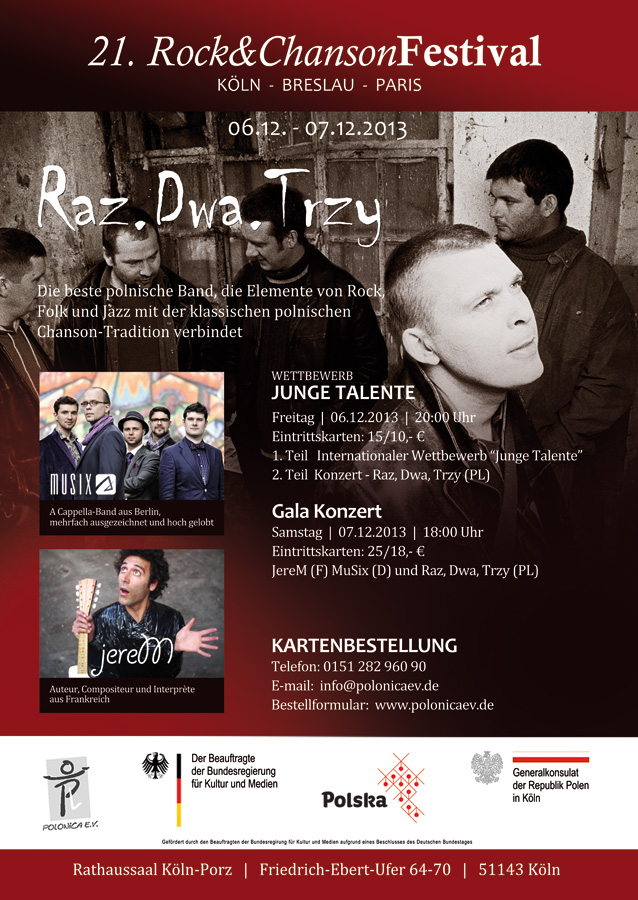 Es freut uns sehr, Ihnen heute das 21. Rock&Chanson Festival „Köln-Breslau-Paris“ des Vereins Polonica e.V. ankündigen zu dürfen. Das diesjährige Festival findet am 06.12. und 07.12.2013 im Rathaussaal Köln-Porz, Friedrich-Ebert-Ufer 64-70 in 51143 Köln statt. Traditionell treten dort junge Sängerinnen und Sänger auf sowie beliebte und erfolgreiche Künstler, die Sie durch ihre Lieder auf eine Reise nach Polen, Frankreich und Deutschland mitnehmen. In diesem Jahr sind wir stolz Ihnen eine der bekanntesten polnischen Musikbands, die die Elemente von Rock, Folk und Jazz mit der klassischen polnischen Chansontradition verbindet, präsentieren zu können: "Raz. Dwa. Trzy.". Aus Frankreich kommt zudem der Sänger JereM zu uns und aus Deutschland beehrt uns die renommierte A Cappella-Formation MuSix. Tickets können ab sofort über das Bestellformular gekauft werden bzw. telefonisch unter 0151-282 960 90 oder 0176-79 55 02 22