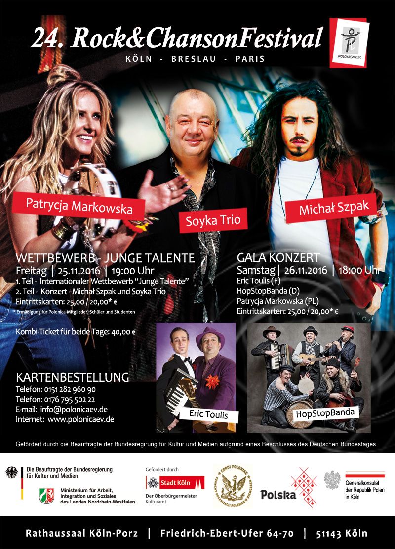 Polsko-Niemieckie Towarzystwo Kulturalne Polonica e.V. zaprasza na 24.Rock&Chanson Festiwal „Kolonia-Wrocław-Paryż”, który odbędzie się w dniach w dniach 25 i 26 listopada w sali ratuszu Köln-Porz przy ulicy Friedrich-Ebert-Ufer 64-70 w Kolonii. Festiwal to wydarzenie łączącego w sobie sceniczne współzawodnictwo młodych Europejczyków z ideą Trójkąta Weimarskiego. Gwiazdami Festiwalu będą jedni z najbardziej popularnych i lubianych polskich artystów: Stanisław Sojka, Michał Szpak oraz Patrycja Markowska. Francję zaprezentuje znany piosenkarz Eric Toulis, a ze strony niemieckiej wystąpi koloński zespół HopStopBanda.