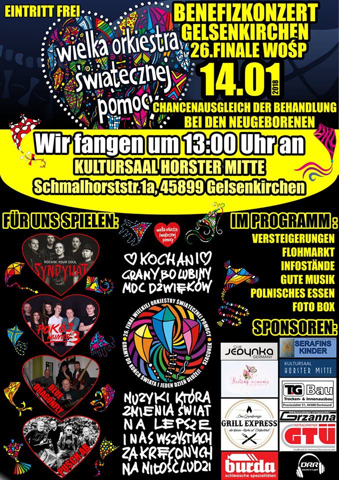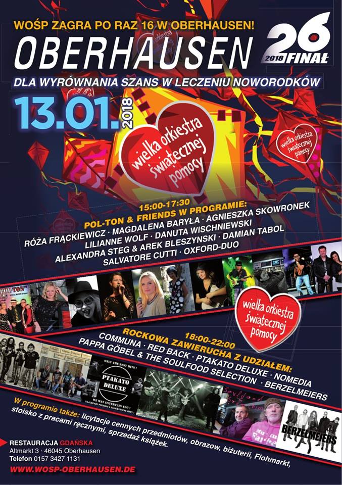 Już od 26. lat z początkiem roku gra Wielka Orkiestra Świątecznej Pomocy (WOŚP) na cele charytatywne doposażenia szpitali w specjalistyczny sprzęt ratujący życie i zdrowie dzieci. W tym roku 14 stycznia Wielka Orkiestra Świątecznej Pomocy zagra po raz 26 nie tylko w Polsce ale też na wszystkich kontynentach. W Niemczech Polonia organizuje Finał WOŚP m.n. w Oberhausen, Hanowerze, Hamburgu, Berlinie, Darmstadt i Frankfurcie. Wielka Orkiestra Świątecznej Pomocy od lat jest uznawana za organizację o największym zaufaniu społecznym w Polsce i wśród Polonii.