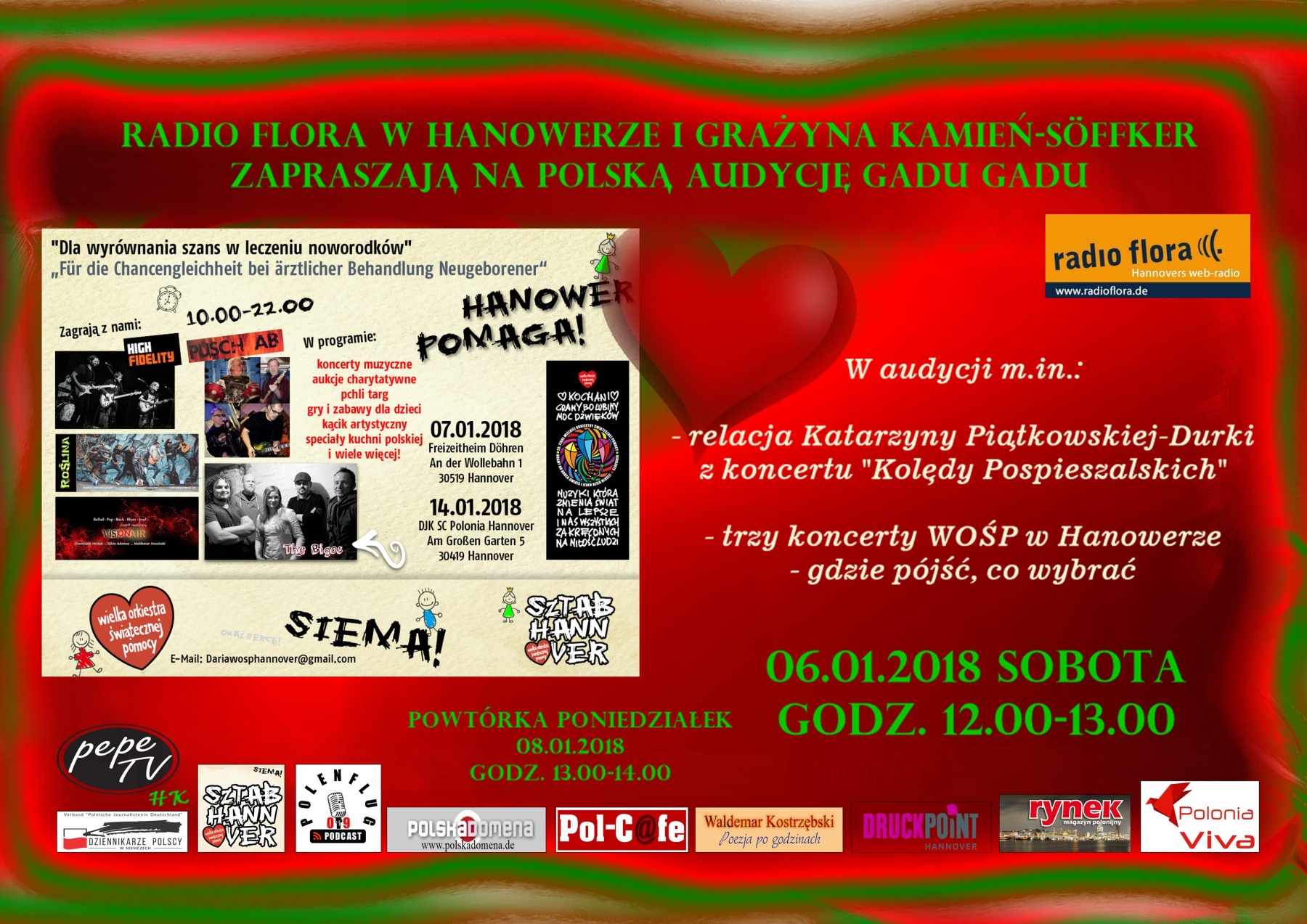 Grażyna Kamień-Söffker zaprasza 6 stycznia 2018, o godz. 12:00 na kolejną audycję “Gadu Gadu” na antenie Radia Flora w Hanowerze. Powtórka audycji w poniedziałek 8 stycznia 2018, o godz. 13:00.