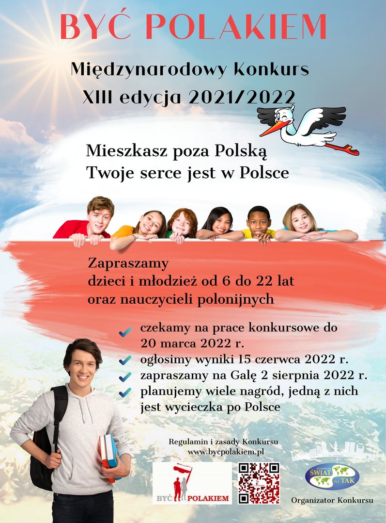 Kochani Uczniowie, Nauczyciele, Rodzice, już po raz trzynasty Fundacja zaprasza "Swiat na Tak" dzieci i młodzież pochodzenia polskiego, mieszkających poza granicami Polski, do udziału w konkursie „Być Polakiem”.