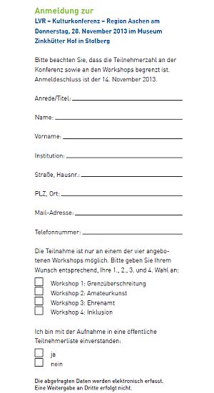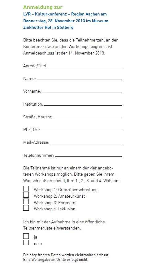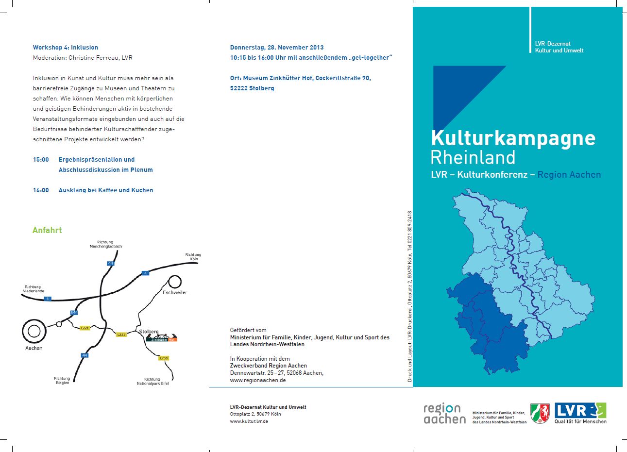 In der Anlage übersende ich Ihnen zur die Einladung zur 2.Kulturkonferenz Region Aachen, die wir in Kooperation mit dem LVR (im Rahmen der Kulturkampagne Rheinland) durchführen. Sie findet statt am