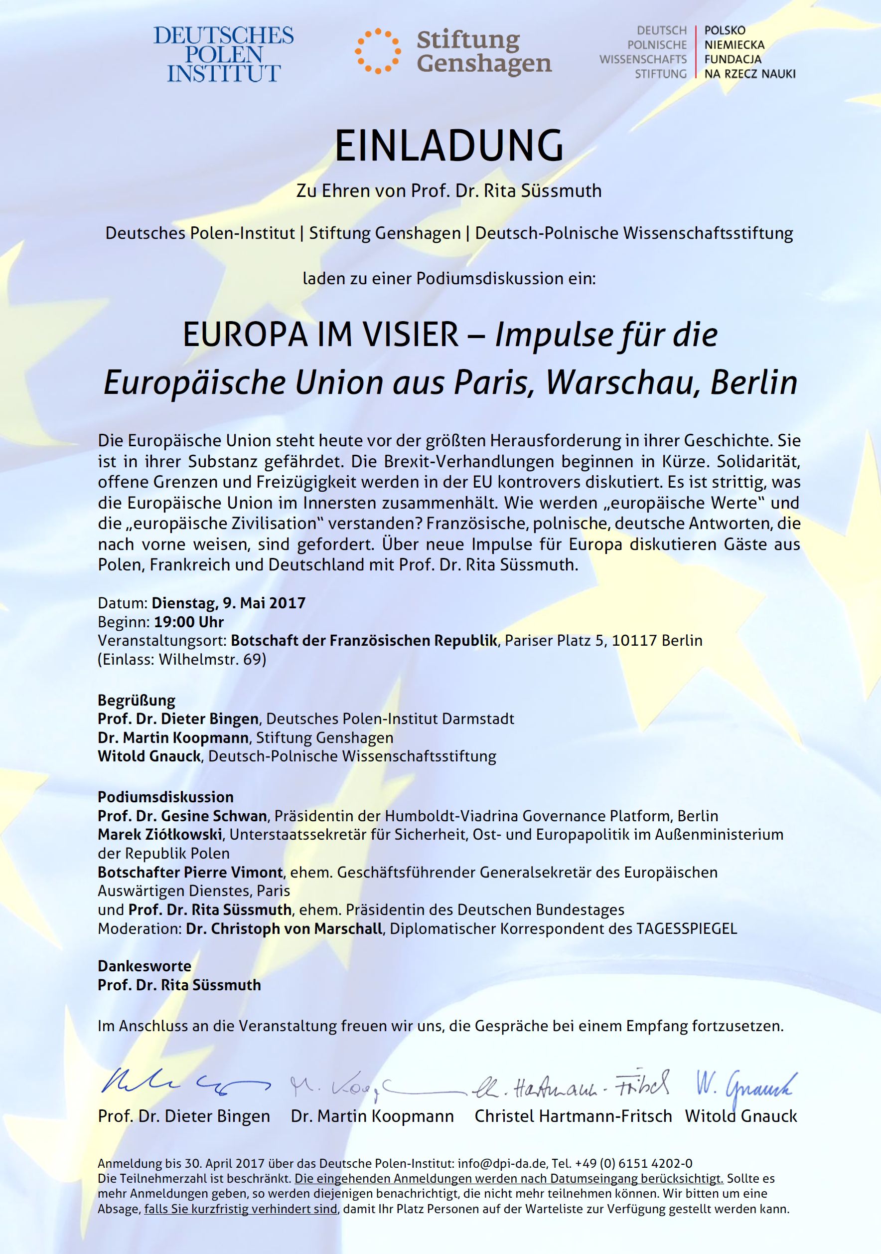 EUROPA W WIZJERZE – Impulsy dla Unii Europejskiej z Paryża, Warszawy, Berlina - Dyskusja panelowa, dla uczczeniaz Prof. Dr. Rity Süssmuth, w dniu 9. Mai 2017, o godz. 19:00 - Ambasada Republiki Francuskiej, Pariser Platz 5, 10117 Berlin (Wejście od strony: Wilhelmstr. 69)