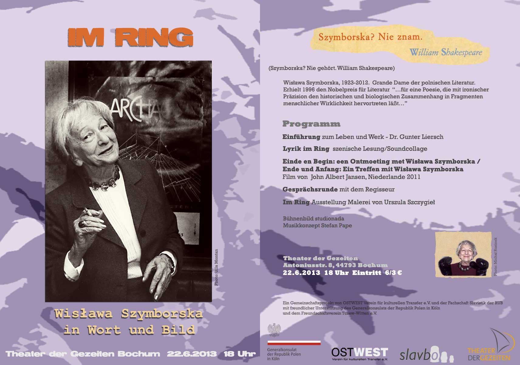 Damit diese Worte der polnischen Literatur-Nobelpreisträgerin, welche sie selbstironisch in die Feder Shakespeares schrieb, nicht nach ihrem Tod im Jahr 2012 eintreten, präsentieren der OSTWEST Verein für kulturellen Transfer e.V. und die Fachschaft Slavistik der RUB einen Portraitabend über Wisława Szymborska.