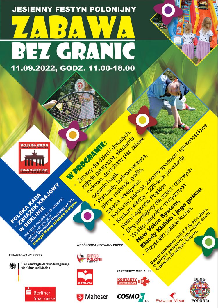 Serdecznie zapraszamynie Polonięna nasz coroczny Jesienny Festyn Polonijny w Berlinie "Zabawa bez Granic"! Spotykamy się 11 września br. od godz. 11.00 do 18.00 na łące przy Alter Bernauer Herrweg 31 (nowe Miejsce)- zapewniemy bogaty program dla dzieci i dorosłych. Czekamy na Was!
